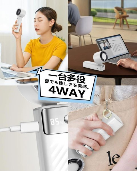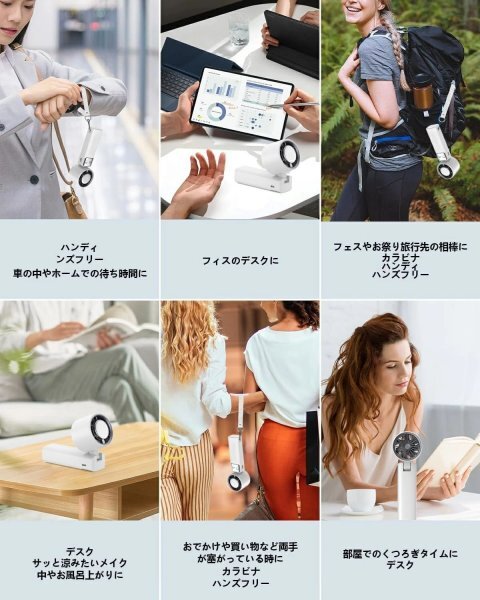 本商品は手持ち扇風機、卓上扇風機、腰掛け扇風機として機能を兼ね備えていて、どの場でも気軽にご使用いただけます。