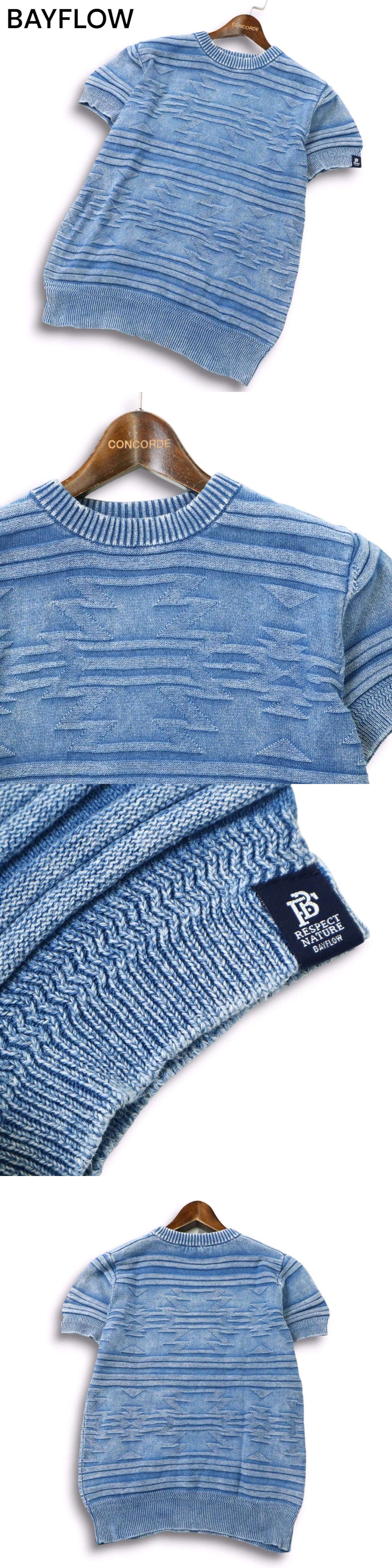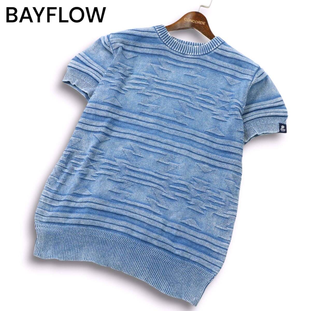 BAYFLOW ベイフロー 春夏 ネイティブ柄★ ジャガード ウォッシュ加工 インディゴ 半袖 ニット Tシャツ セーター Sz.2 メンズ