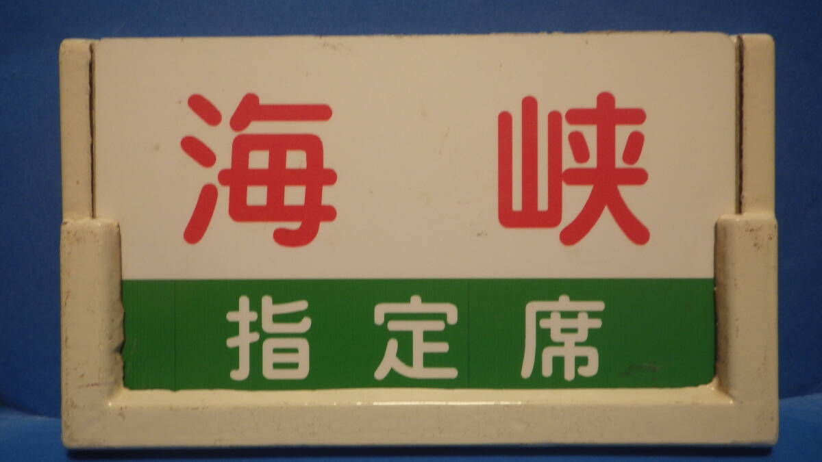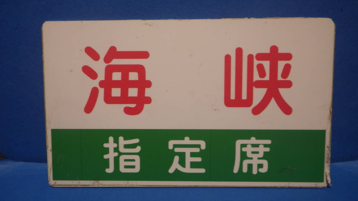 商品は「海峡指定席」はシール貼りです。シールの一部がはがれかかっています。本商品もヤケはありますが目立った状態のヤケではありません。北海道の愛称板は耳付きホーロー板が定番ですが、本商品はプラ板です。「海峡」運行末期のものと思われますが、レプリカの可能性もありますのでこの点ご承知ください。