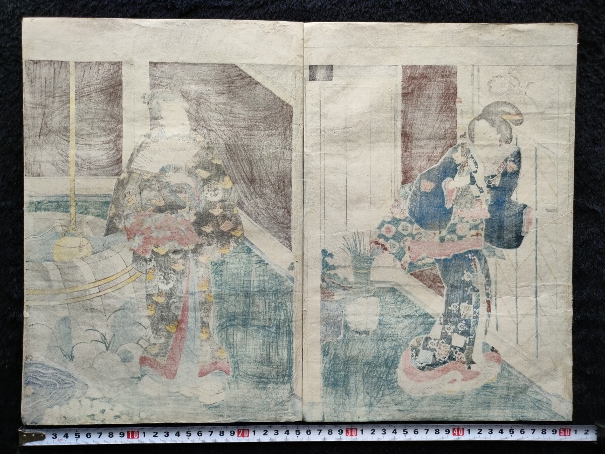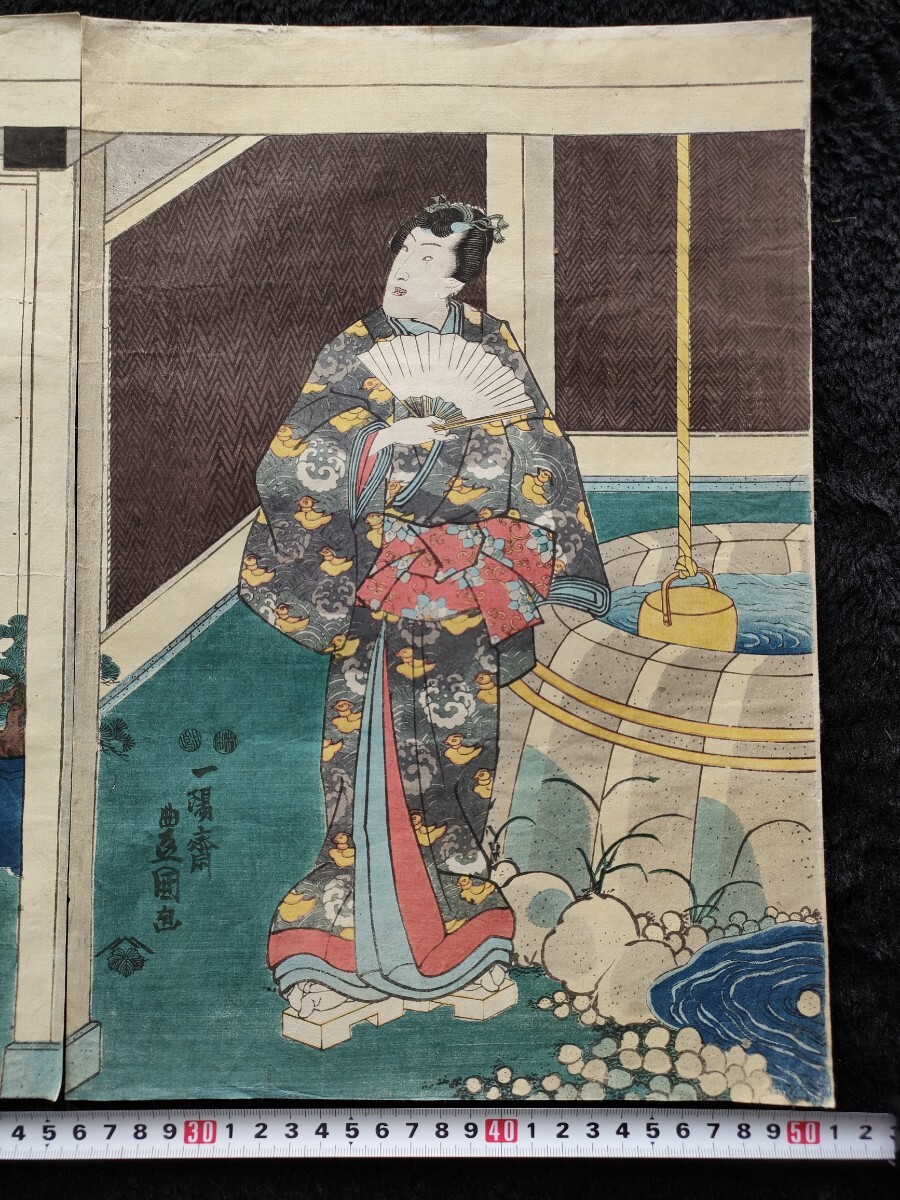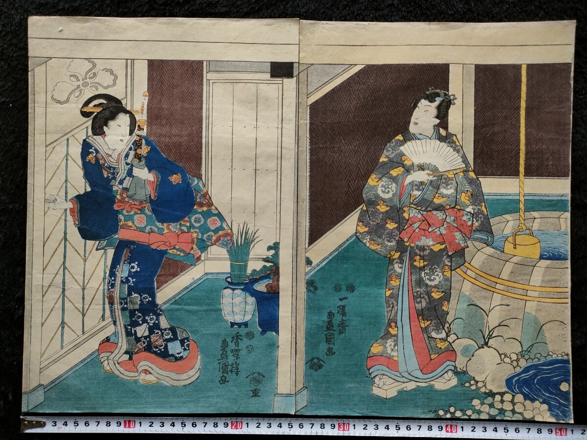 【真作】本物浮世絵木版画 二代歌川豊国【源氏絵】江戸期 役者絵 二枚続 大判 錦絵 保存良い