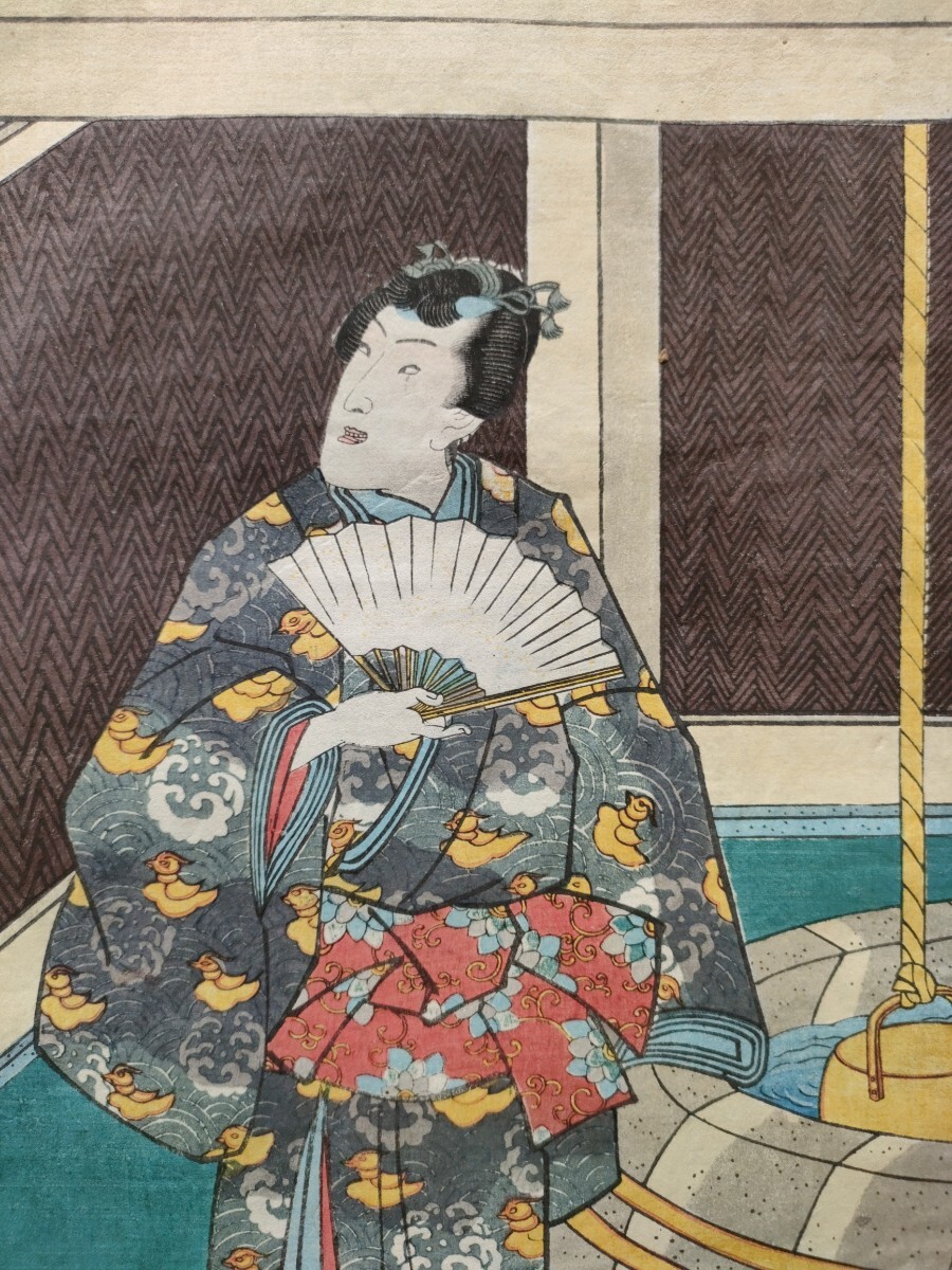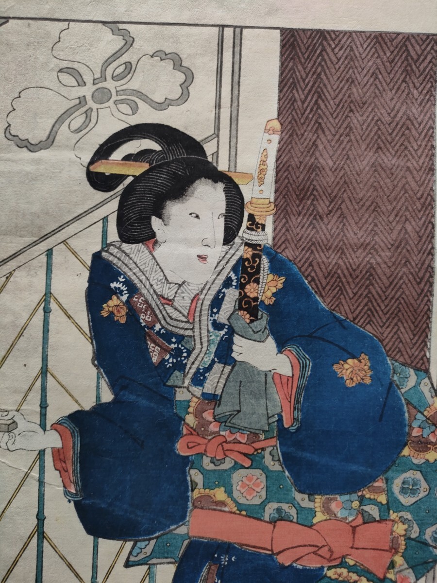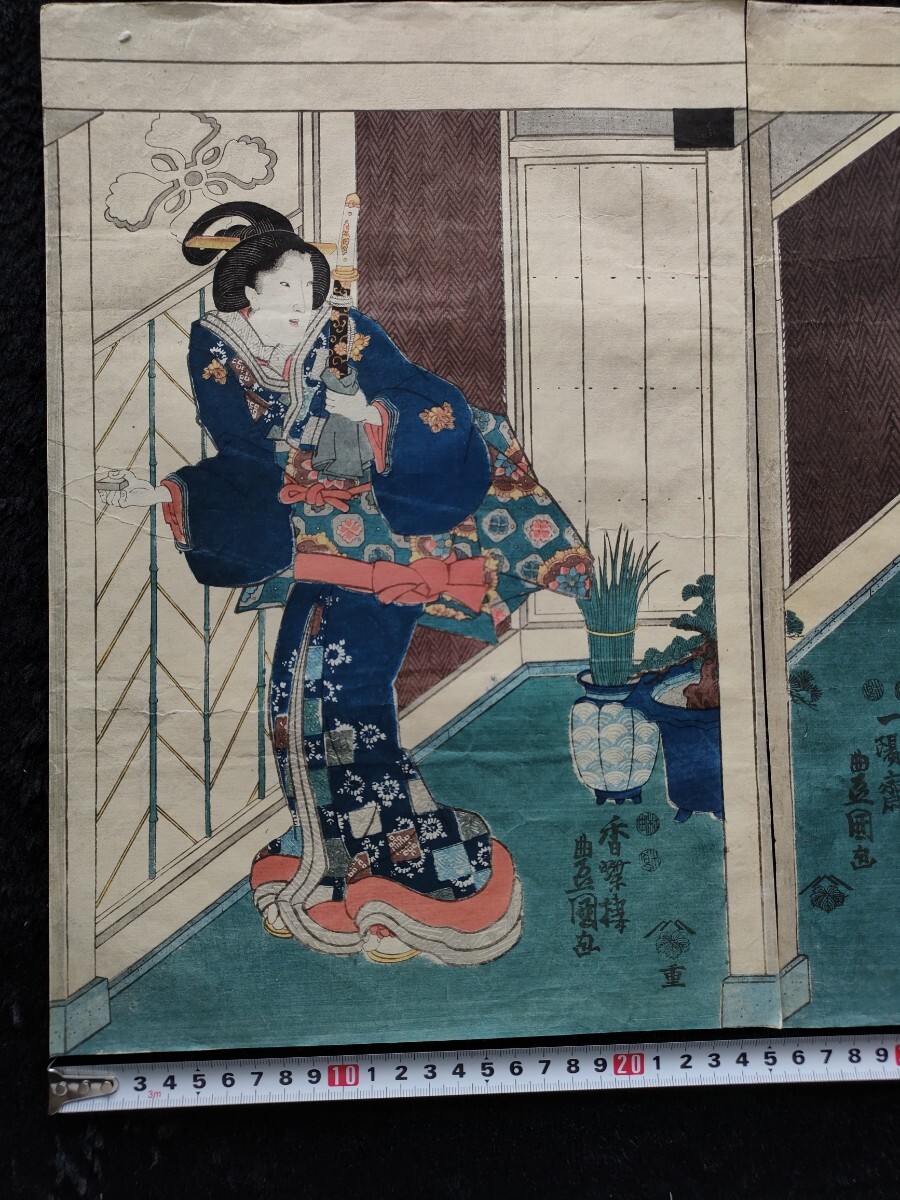 【真作】本物浮世絵木版画 二代歌川豊国【源氏絵】江戸期 役者絵 二枚続 大判 錦絵 保存良い