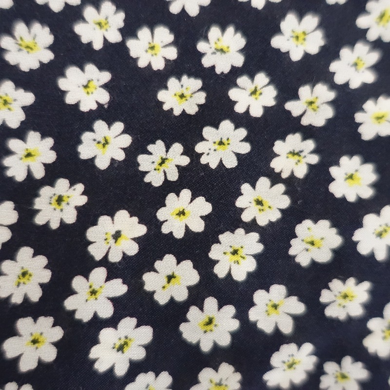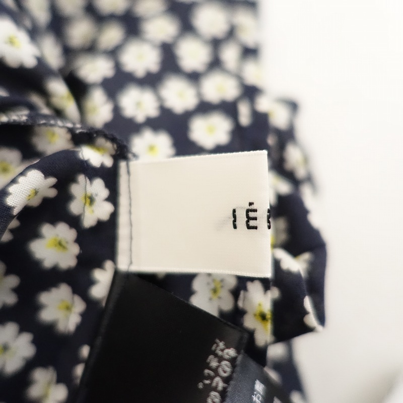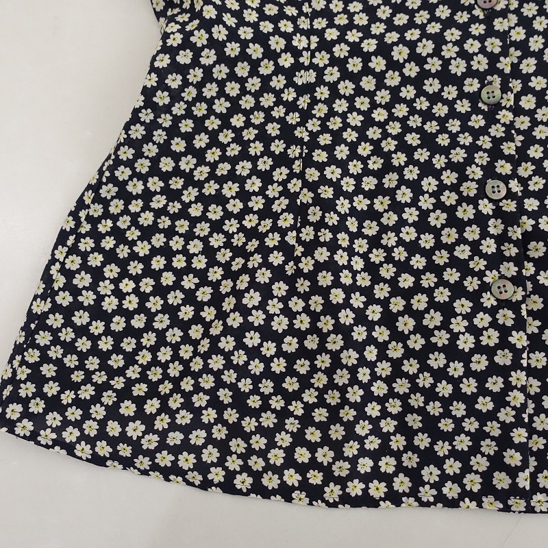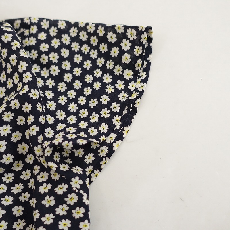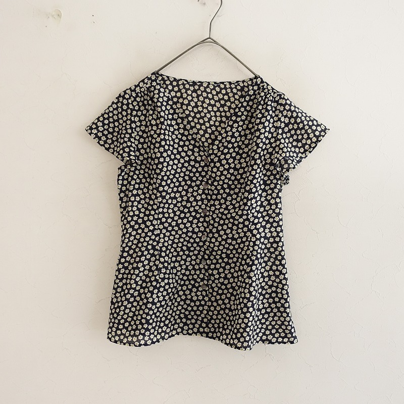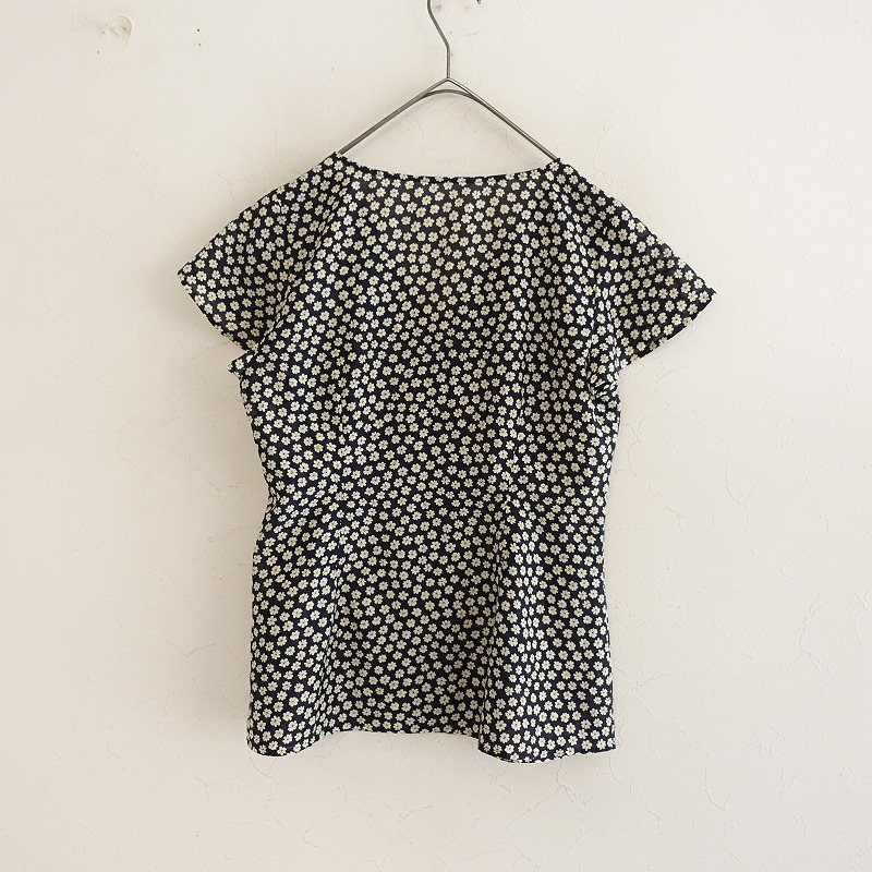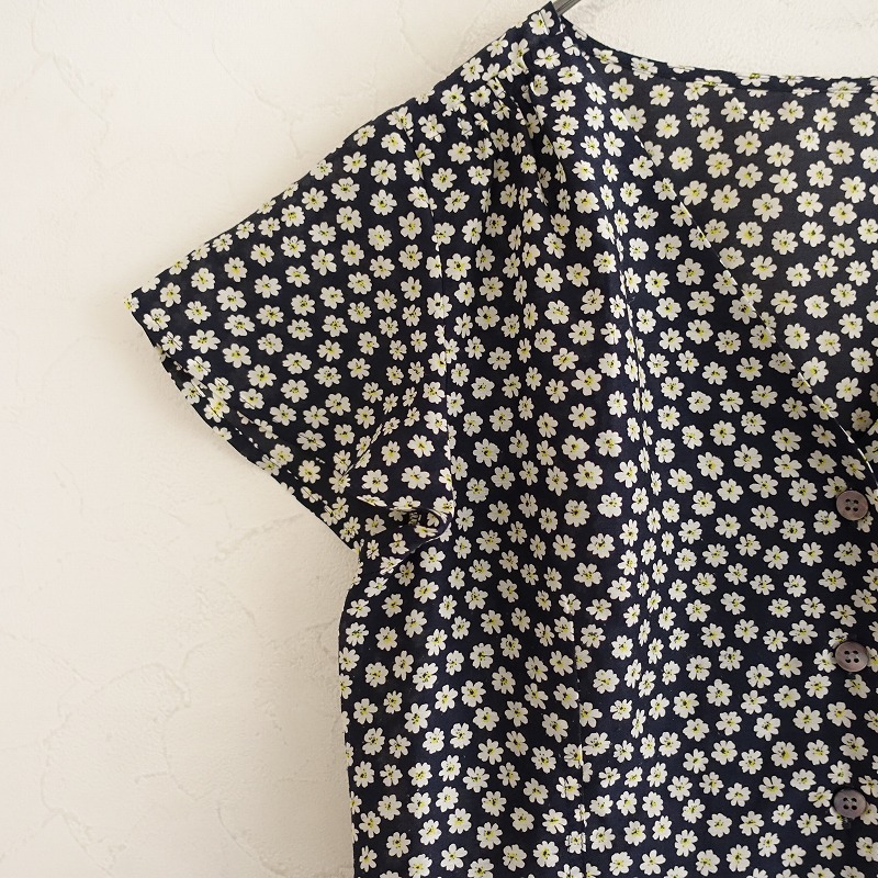 | IENAのレトロフラワー前ボタンVネックブラウスです。カラーはダークネイビー×白・黄色のレトロな花柄プリントです。ポリエステル100%のエアリーな薄手生地を使用。濃い色味のインナーは少し透け感がございます。スッキリとしたVネックのブラウスで、袖はキャップスリーブ。前肩口にギャザーを寄せ、前後身頃に切替やダーツを配し、立体的にウエストマークが作られた仕立てです。ポケットはございません。 |