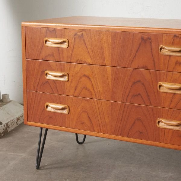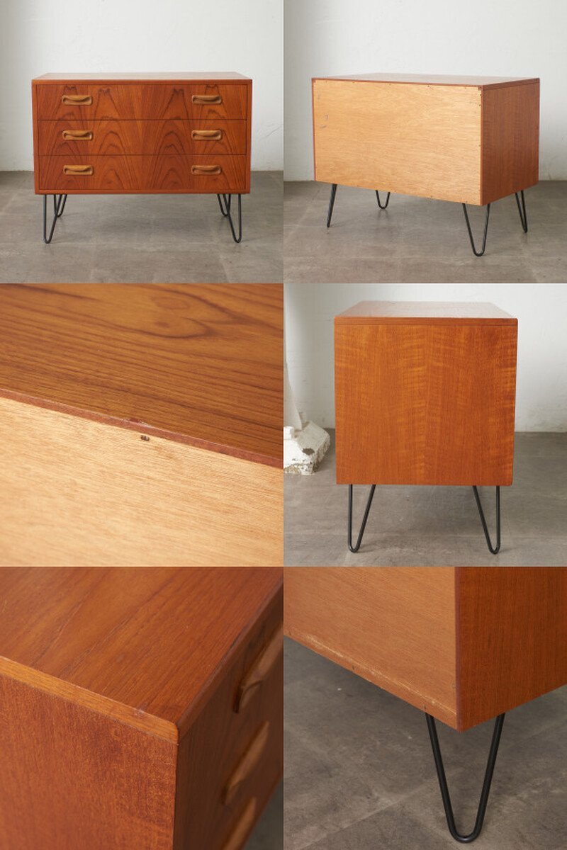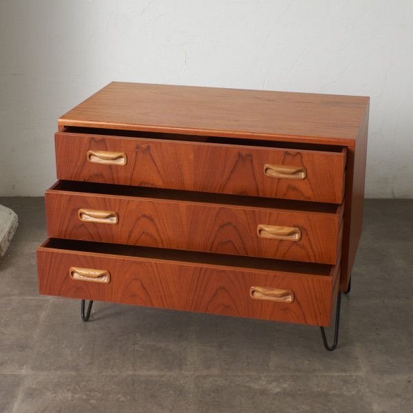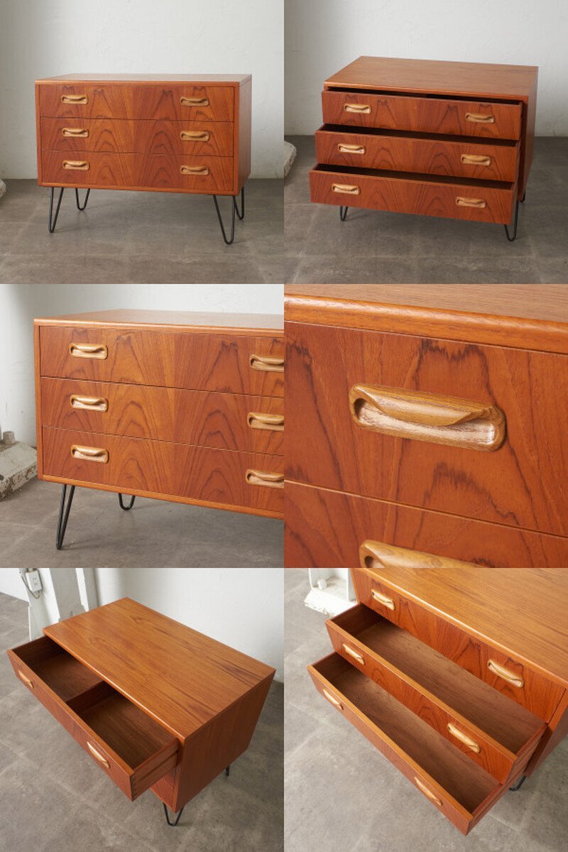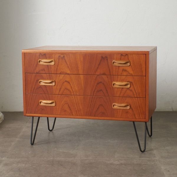 英国ミッドセンチュリーの筆頭ブランド、G-PLAN(ジープラン)による、Victor Bramwell Wilkins(ビクター・ブラムウェル・ウィルキンス)デザイン『Fresco(フレスコ)』シリーズ、カスタム アイアンレッグ 3段チェストです。