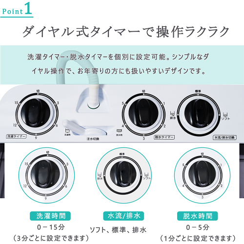 ◎03ダイヤル式タイマーで操作ラクラク 洗濯タイマー・脱水タイマーを個別に設定可能。シンプルなダイヤル操作で、お年寄りの方にも扱いやすいデザインです。洗濯時間:0-15分(3分ごとに設定できます)水流/排水:ソフト、標準、排水脱水時間:0-5分(1分ごとに設定できます)