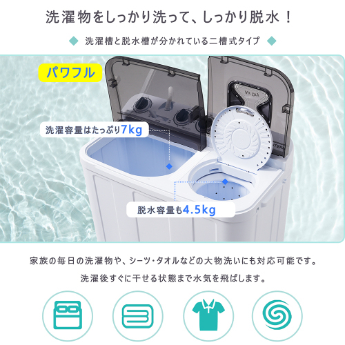 二槽式洗濯機 縦型洗濯機 洗濯7kg/脱水槽4.5kg 大容量 タイマー機能付き コンパクト 小型洗濯機 節電 二槽式洗濯機 まとめ洗い部屋干し