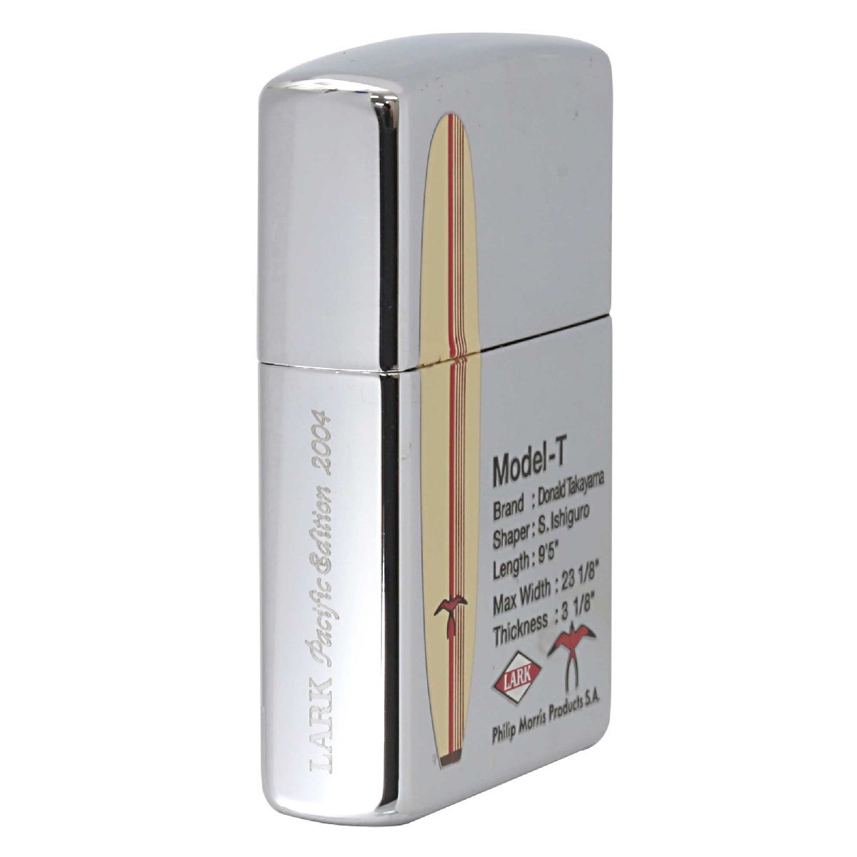 「LARK Pacific Edition 2004」は、伝説のシェイバー、ドナルド・タカヤマ氏が手がけ、ラークがデザインしたサーフボードをモチーフに製造されたZIPPO。ハイポリッシュクローム、プリント。