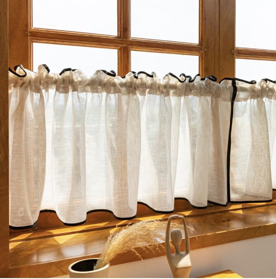 縁取りの黒いテープがお洒落なカフェカーテン。