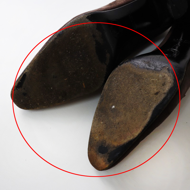インソールに黒ずみ汚れ、ソールに減り、金具に小傷が見受けられます。