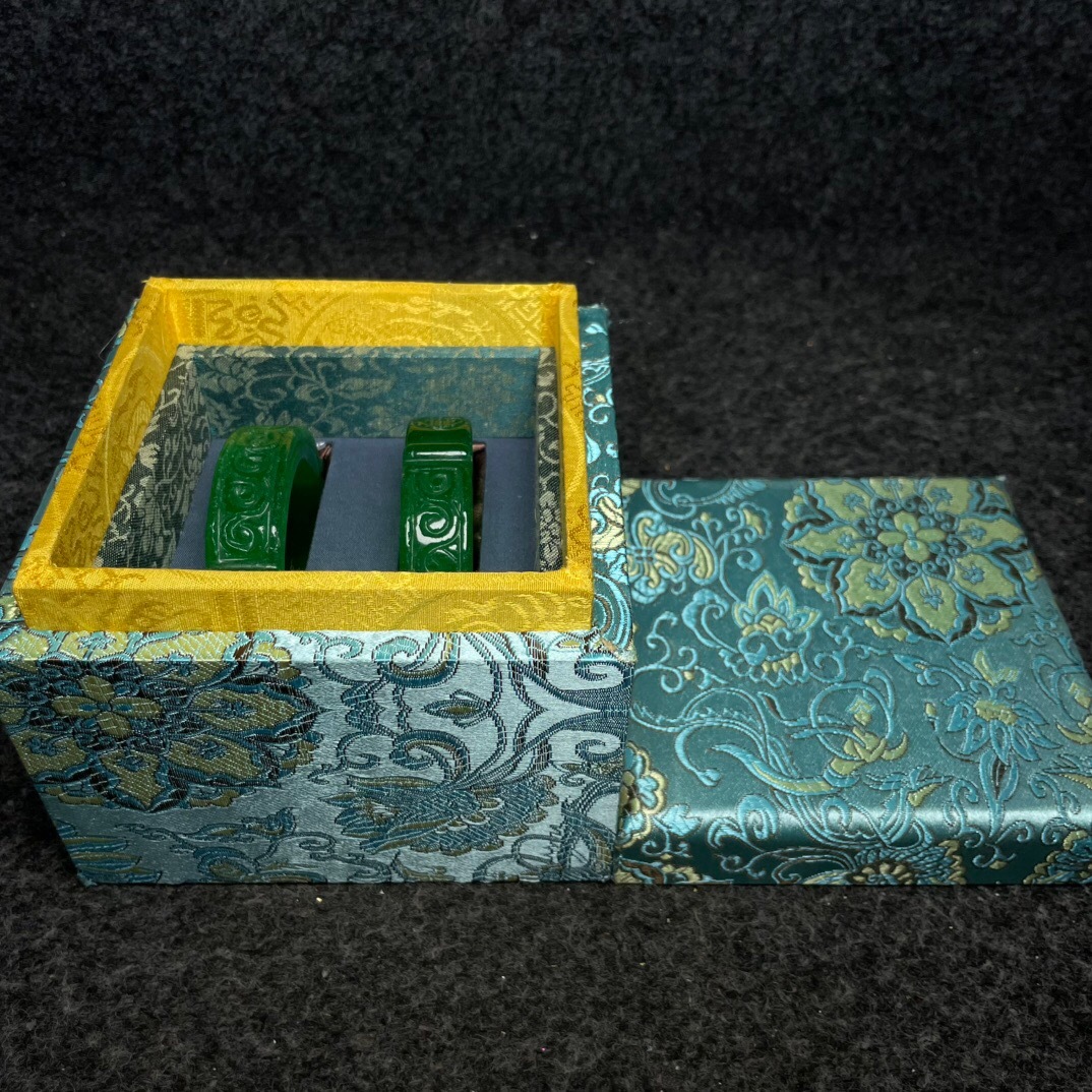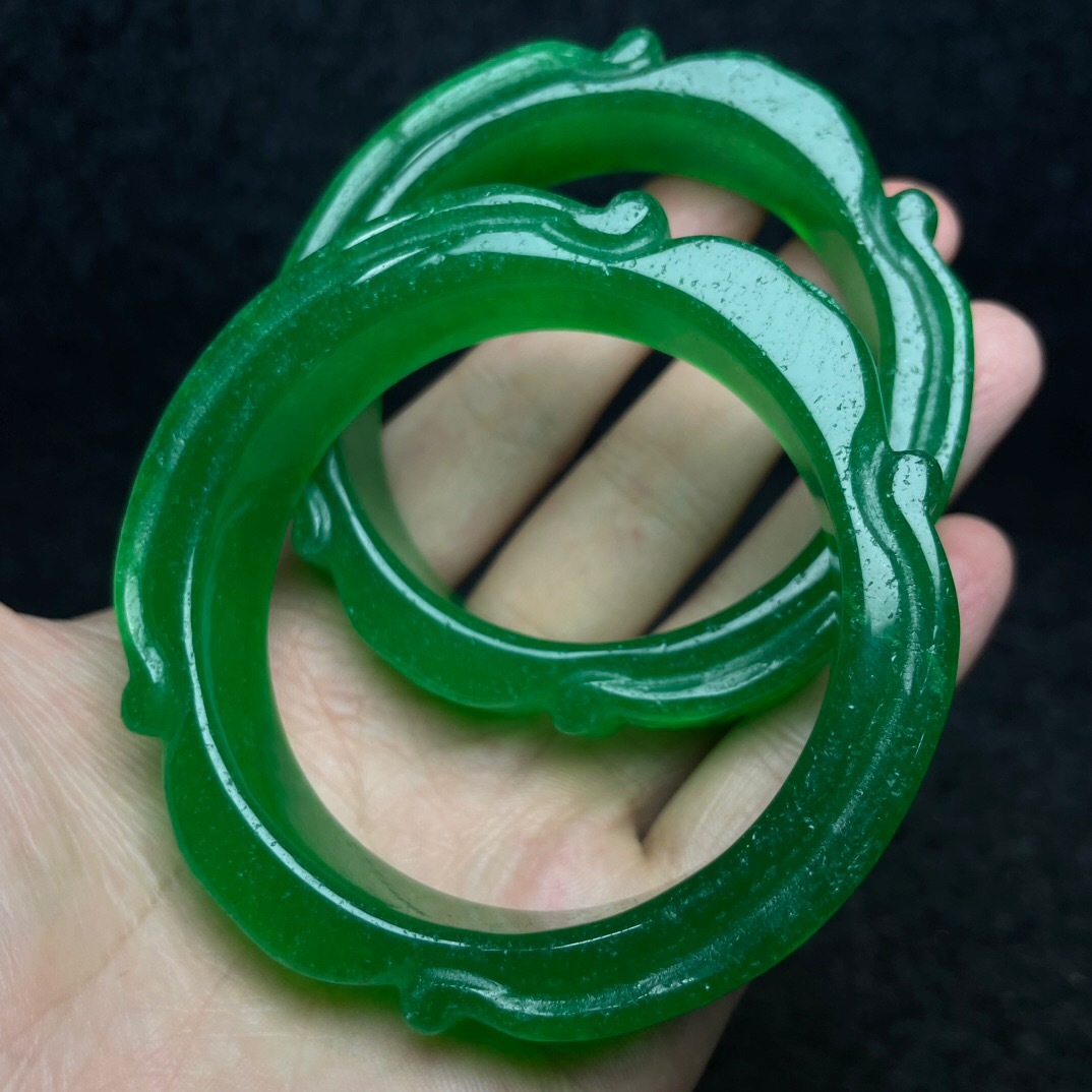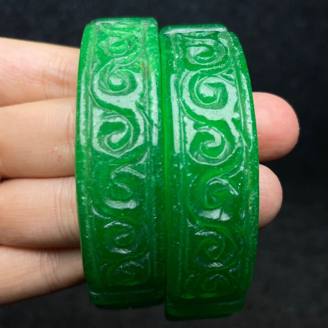 ▽鴻▽ 翡翠製 細密彫 腕輪一對 箱付 根付 裝身具 古賞物 古董品 時代物 稀少珍品 中国古玩 中国古美術