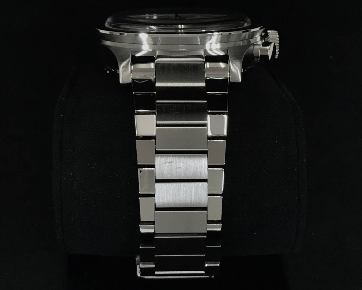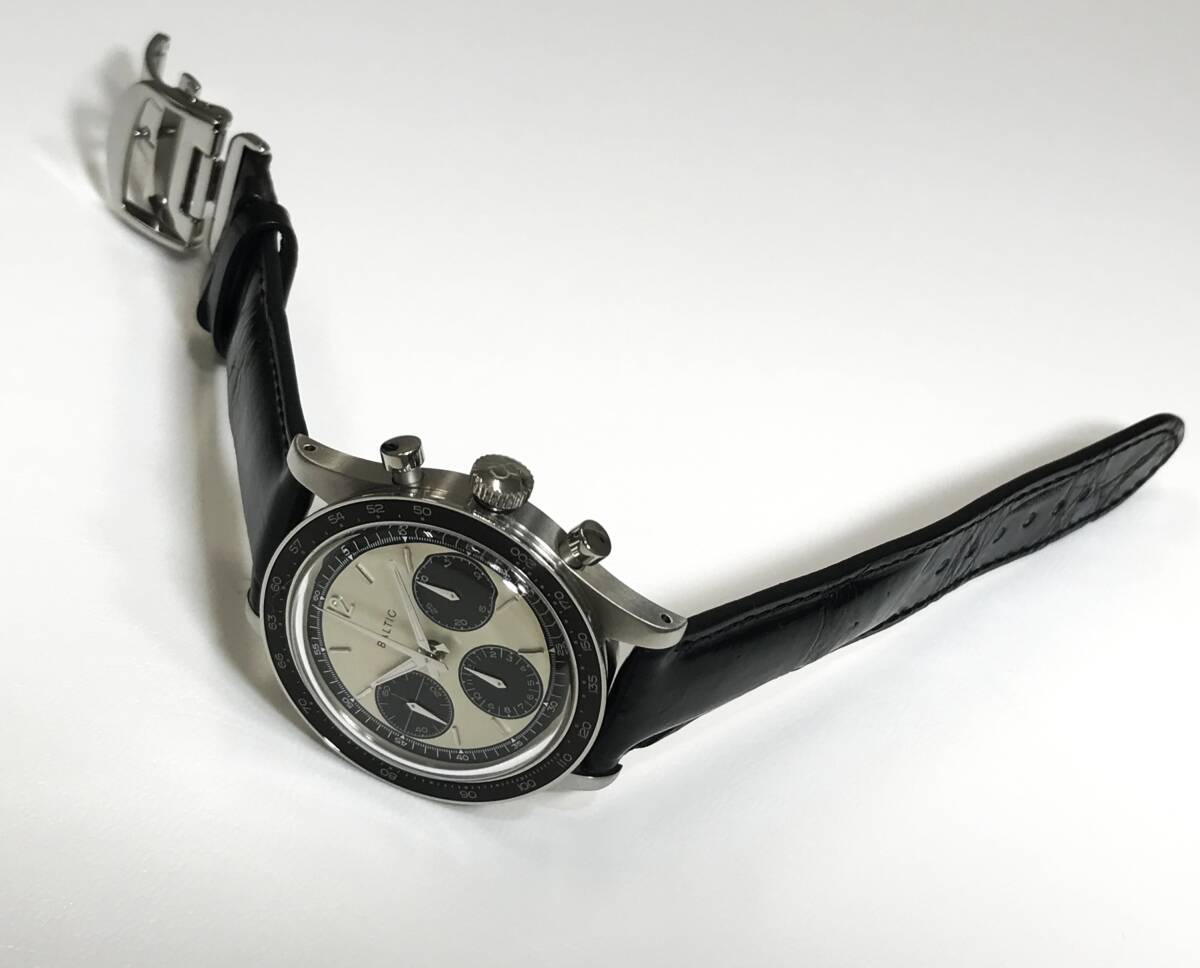 ブ ラ ン ド :BALTIC / バルチック 商 品 名 :トリコンパックス パンダ 商 品 番 号 :bl-tricompax-panda ケース素材 :316Lステンレススチール ベルト素材 :316Lステンレススチール 風 防 :内部無反射コーティング ダブルドームサファイアクリスタル ベ ゼ ル :アルミニウム製タキメーター ダ イ ヤ ル :ライトベージュマット細かい粒状ダイヤル サブダイヤル:ブラックギョーシェ 防 水 :5ATM(50m防水) ケースサイズ:幅 39.5mm(リューズ含まず)/ ラグtoラグ 47mm 厚 13.5mm(風防込み) 10.7mm(風防除く) / ラグ幅 20mm ムーブメント:SELLITA SW510-M(手巻き) 機 能 :クロノグラフ、ハック機能、ブレスレット クイックレバー パワーリザーブ:63時間 付 属 品 :純正BOX、ギャランティカード ※デジタル式のギャランティ Warranty code:W×××××× Activation date:2023年9月4日 Ending date of varidity:2025年9月4日 保 証 :メーカー保証2年(ムーブメントのみ) 状 態 :本体:中古美品 ブレスレット:未使用(バックル保護フィルム残り) 日 差 :+5秒程度(24時間平置き) ※記載のスペックは、H°M'S” WatchStore販売サイト、HODINKEE、ZENMAIのココ東京より引用しています。より詳しい情報が記載されていますので、下記にリンクを張っておきます。 2022年新作バルチック トリコンパックス Baltic tricompax Pandaになります。2022年12月に予約注文が開始され、最初の400個(各200個)のケースバック番号付きが2023年4月に出荷、番号なしが2023年9月に出荷されました。こちらは、2023年秋に番号なしを購入したものになります。購入後、革ベルトに付け替えて、ブレスレットは一度も使用せず保管しておりました。時計を多数所有しているため、短時間、数回使用した程度です。本体に目視でわかるようなキズは見当たらず、とても良好なコンディションです。ガラスにはも傷は見受けられません。針や文字盤の状態も良好です。出品にあたり、ブレスレットは本体に戻してあります。ブレスレットは未調整ですので、コマ調整は落札者様にてお願い致します(短い場合のためだと思いますが、予備コマが引き出しギャランティカード下に入っています。)画像に映っている未使用の社外クロコダイルベルト(ブラック)、ステンレス製BAMBI三つ折れDバックルもお付けします。ブレスレットはクイックレバーになっていますので、工具なしで簡単に付けけることが可能です。夏はブレスレット、冬は革ベルトに付け替えてもいいと思います。24時間平置きにて精度を計測しましたが、日差+5秒程度でした。クロノグラフも問題なく作動します。使用頻度が少なく、今後も使用しないと思われるため出品いたします。 【 H°M'S” WatchStore 】 BALTIC WATCHES / バルチックトリコンパックス パンダ フラットリンク ブレスレット youtube:BALTIC/バルチック バルチックトリコンパックス 【 HODINKEE 】 HANDS-ON バルチックが待望のパンダとリバースパンダダイヤルのクロノグラフを発表 【 ZENMAIのココ東京 】 【2022年新作】バルチック トリコンパックス Baltic “Panda & Reverse Panda” 39.5mm 手巻きクロノグラフ |