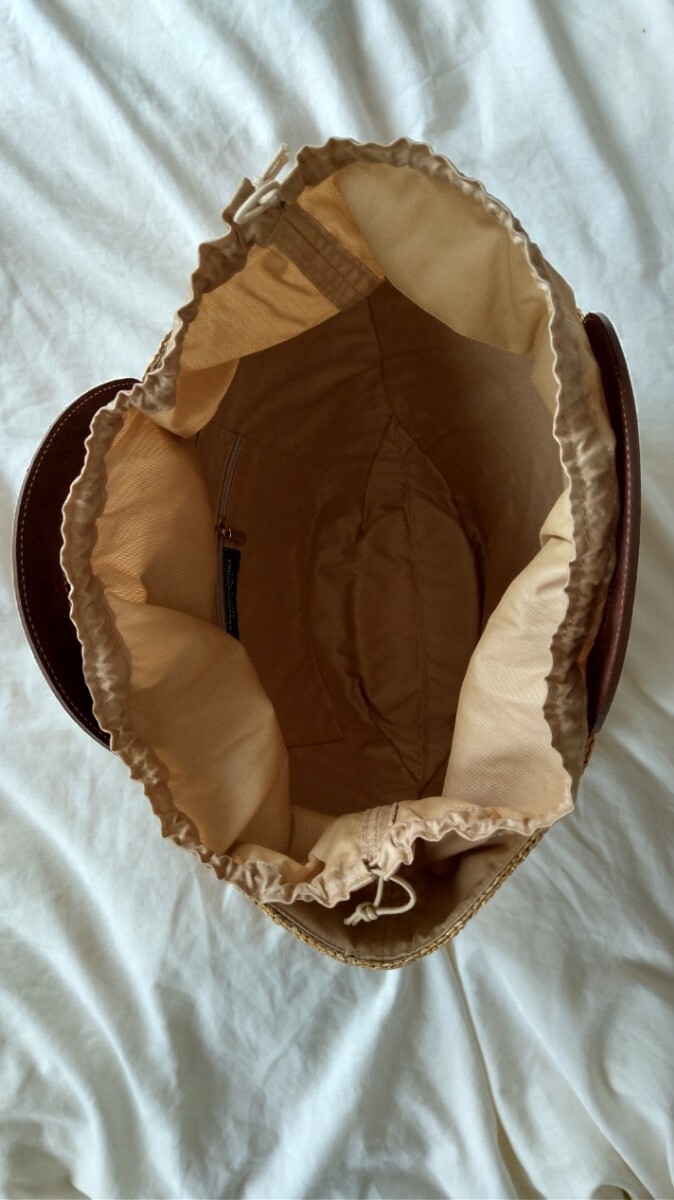 バッグ内側は巾着で紐で縛って使うタイプなので中にしまったものが外からは見えないようにできるので◎。