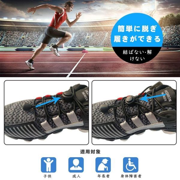 商品情報 カラー 01_(ブラック) 02_(ホワイト) 04_(ブルー) 05_(ピンク) 06_(蛍光イエロー) 07_(オレンジ) 08_(蛍光緑) 09_(紺色) 10_(パープル) 11_(ブラウン) 12_(グレー) 仕様: -靴ひも長さ 約120cm、ひも直径 約3.0mm -主要材質 ゴム /プラスチック樹脂 ※長さが余る場合は紐をカットするため、100cm以下の紐の長さに対応します。 レースロックで靴の着脱やスポーツをもっと簡単・快適に! アスリートのみでなくお子様からご高齢者、どなたでもお使いいただけます。また、運動目的以外でも散歩や普段靴への使用など、色々な目的でご使用いただけます。 ソフトな装着感:靴ひもは伸縮性のある素材のため、靴ひもの圧力を足に均等に分散させ快適です。 ほどけない:靴ひもを結ばず固定するため、靴ひもがほどけてしまうことがありません。 調整が容易:靴ひもはアジャスターにより締めたり緩めることが可能です。長さ調整部品を動かすことで靴ひもを緩めます。 簡単な着脱:靴ひもを毎回結ぶ必要が無く>、靴が履きやすく脱ぎやすい靴ひもです。
