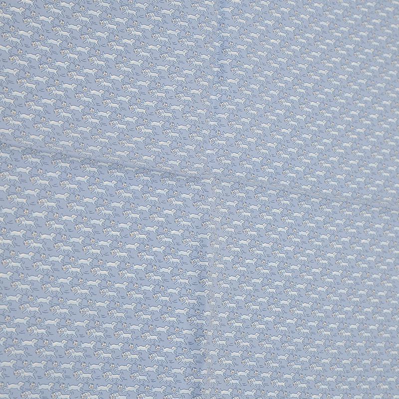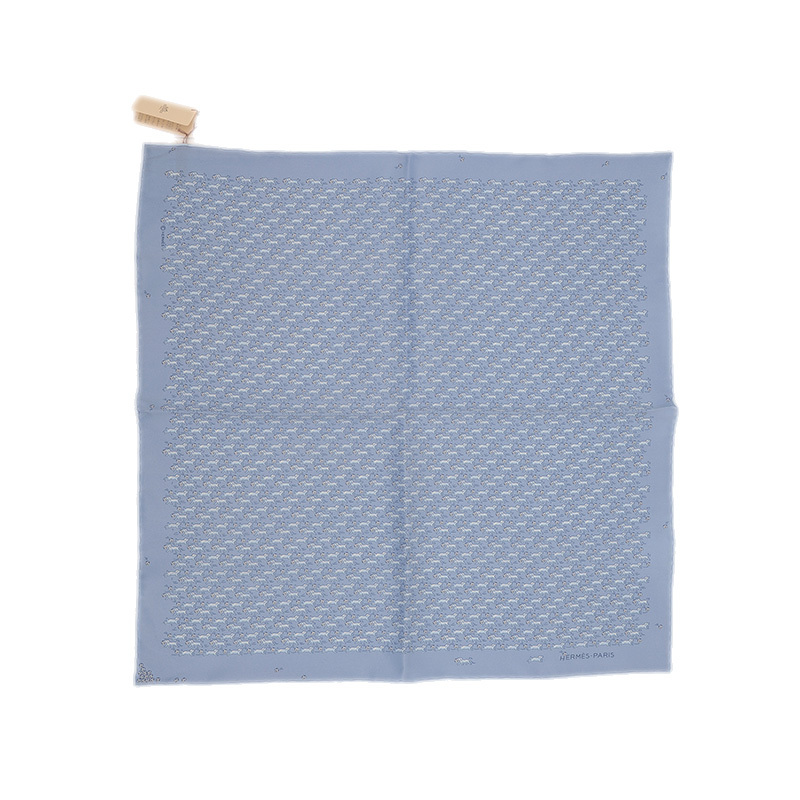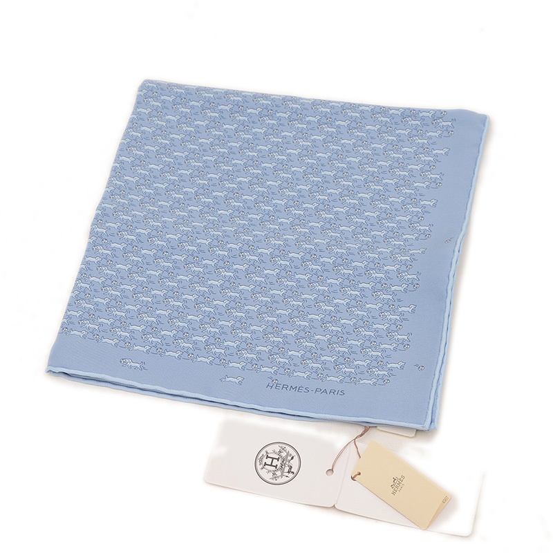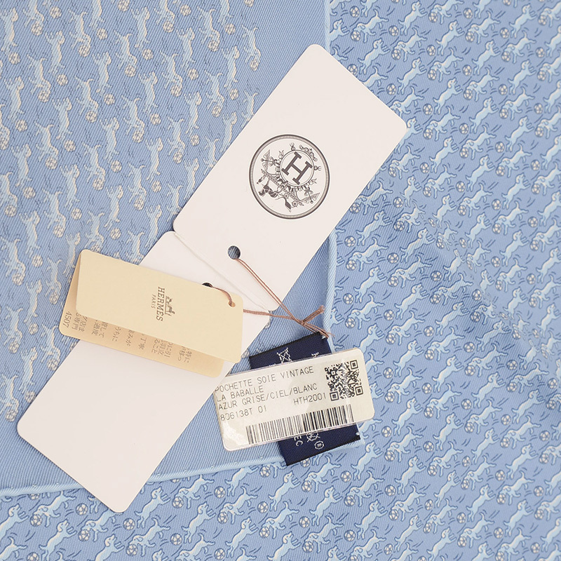 商品特徴 | 上質なヴィンテージシルクを使用した、45cm角の小ぶりなポケットチーフです。アズール(青)、グリ(グレー)、シエル(水色)、ブラン(白)の鮮やかな色彩で、ボール遊びをする犬が描かれた「LA BABALLE」柄が、遊び心とユーモアを添えます。ジャケットの胸元に挿すだけで、装いに上品な彩りと個性的なアクセントをプラスする逸品です。 |
