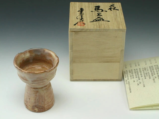 今回出品の作品は、萩焼の伝統的な技法に現代的な感性を融合させた作風で名高い人気作家、金子信彦先生の萩焼枇杷色馬上盃です。萩焼らしい枇杷色で、手捻りという技法で作られた馬上盃です。登り窯焼成による見事な窯変と手に馴染む形、すばらしい出来栄えの金子信彦先生作「萩焼馬上盃」をお手元に。是非この機会にお求め下さい。