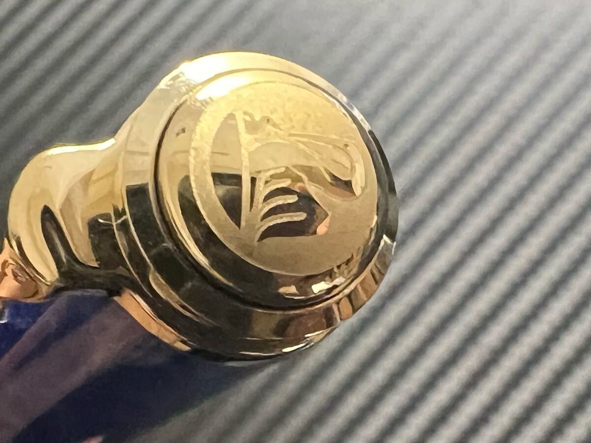 黒の樹脂にロゴプリントだった天冠から一転、レーザー刻印の施されたゴールド天冠となっています。