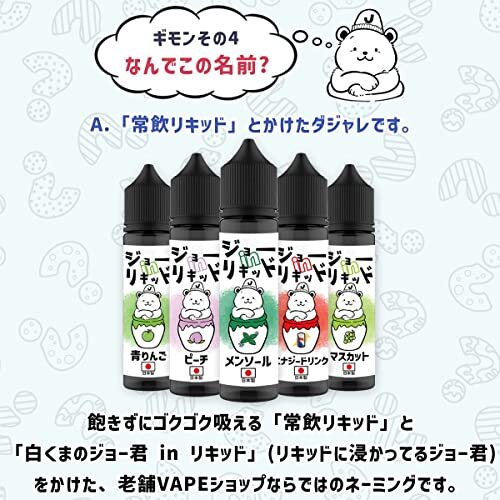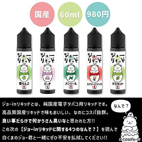 「ジョー・イン・リキッド」=常飲リキッドです。美味しくて漏れにくいをコンセプトに全てのベイパーに常飲されるべく一貫して国内で企画・開発・生産をしたジョーinリキッド。今後続々新フレーバーをリリース予定です。【濃厚】大人気のマレーシアリキッド「MONSTA VAPE」クラスの濃厚さを実現!【大容量】は嬉しいんだけと口に合わないか不安→ちょうどいい60mlで解決。【知ってました?】液漏れの90%以上がリキッドの粘度が原因です。カートリッジ側の要因はごく僅かで、大容量な商品に多い「サラサラ」のリキッドが漏れの要因です。ジョーinリキッドはリキッドの粘度にもこだわっています。【検査済み】国内生産、検査機関で検査済みの安全な商品です。濃厚、安全安心の「常飲」できるリキッド、それが「ジョーinリキッド」です。