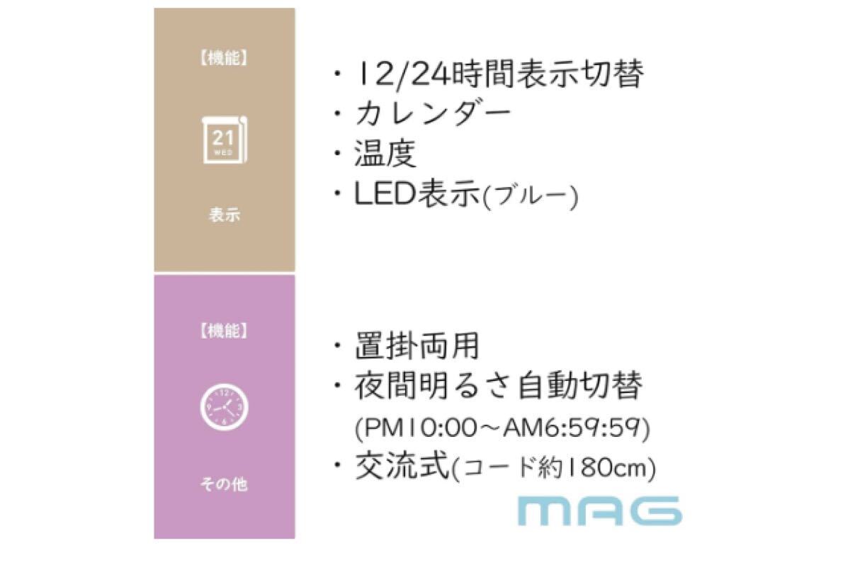 機能:カレンダー表示、夜間明るさ切替 (午後10時~午前6時59分59秒)、12/24時間表示切替、温度表示、LED表示 (ブルー)、交流式 (コード:約180cm)