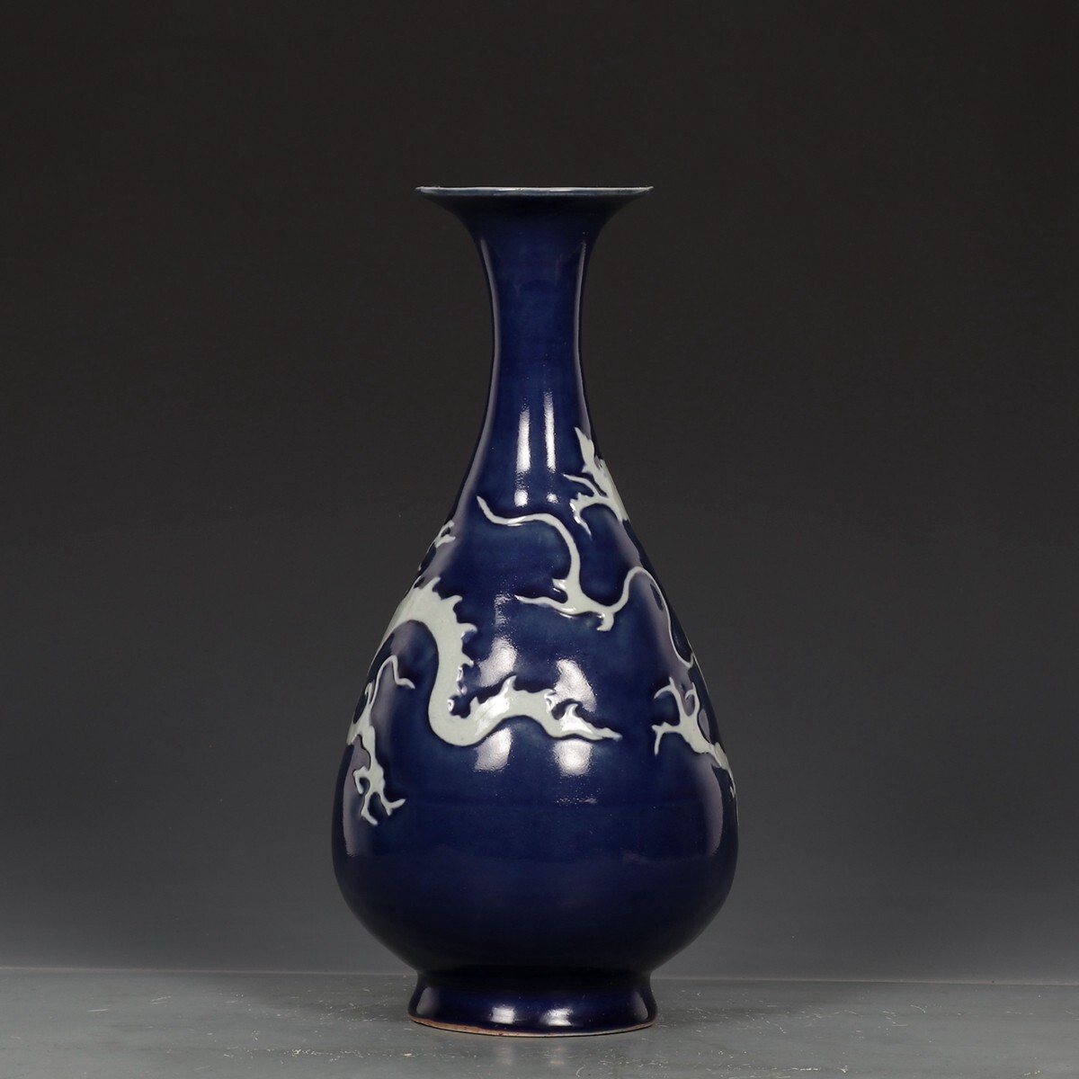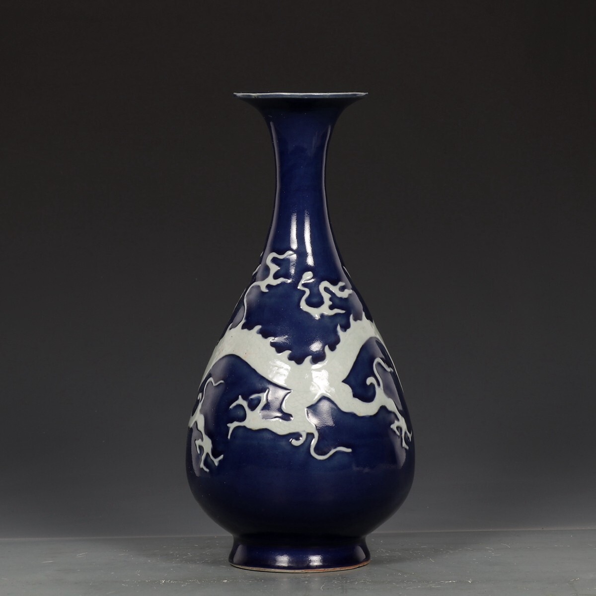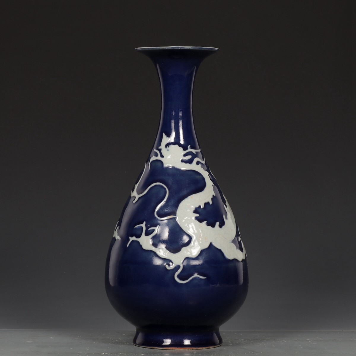 元代 陶磁器 霽藍留白龍紋 玉壺春瓶【仁】染付 置物擺件 古賞物 古美術 中国古玩 蔵出