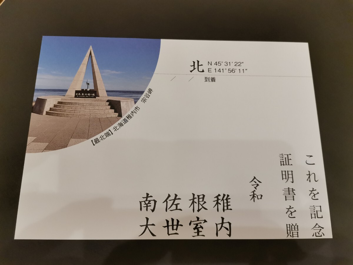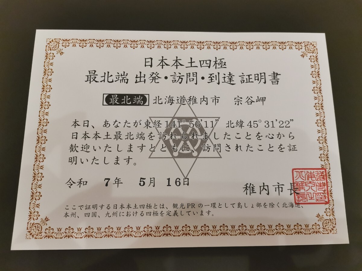稚内市役所でいただいた、最北端出発訪問到達証明書になります。