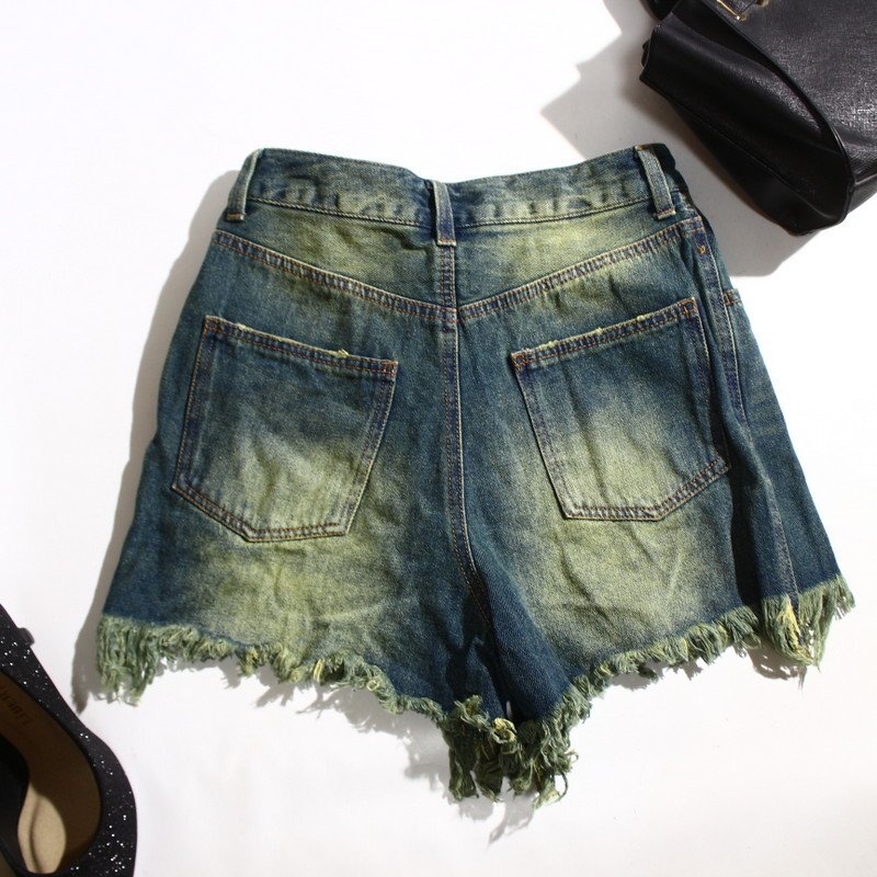 Detailこなれ感の出るカットオフした裾のフリンジが目を惹くデニムショートパンツです。足長効果も狙えるハイウエストデザインでヘルシーな雰囲気にカラーヴィンテージ加工を施した二色展開でご用意しております!クロップド丈との相性が良くハイウエストで着て頂くと足長効果抜群です。