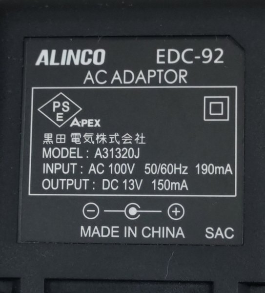 アルインコ/ALINCO ACアダプター EDC-92 13V 150mA   動作OK
