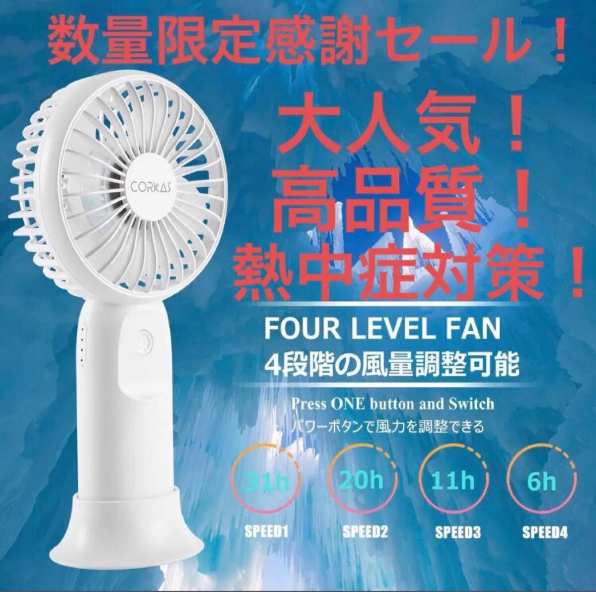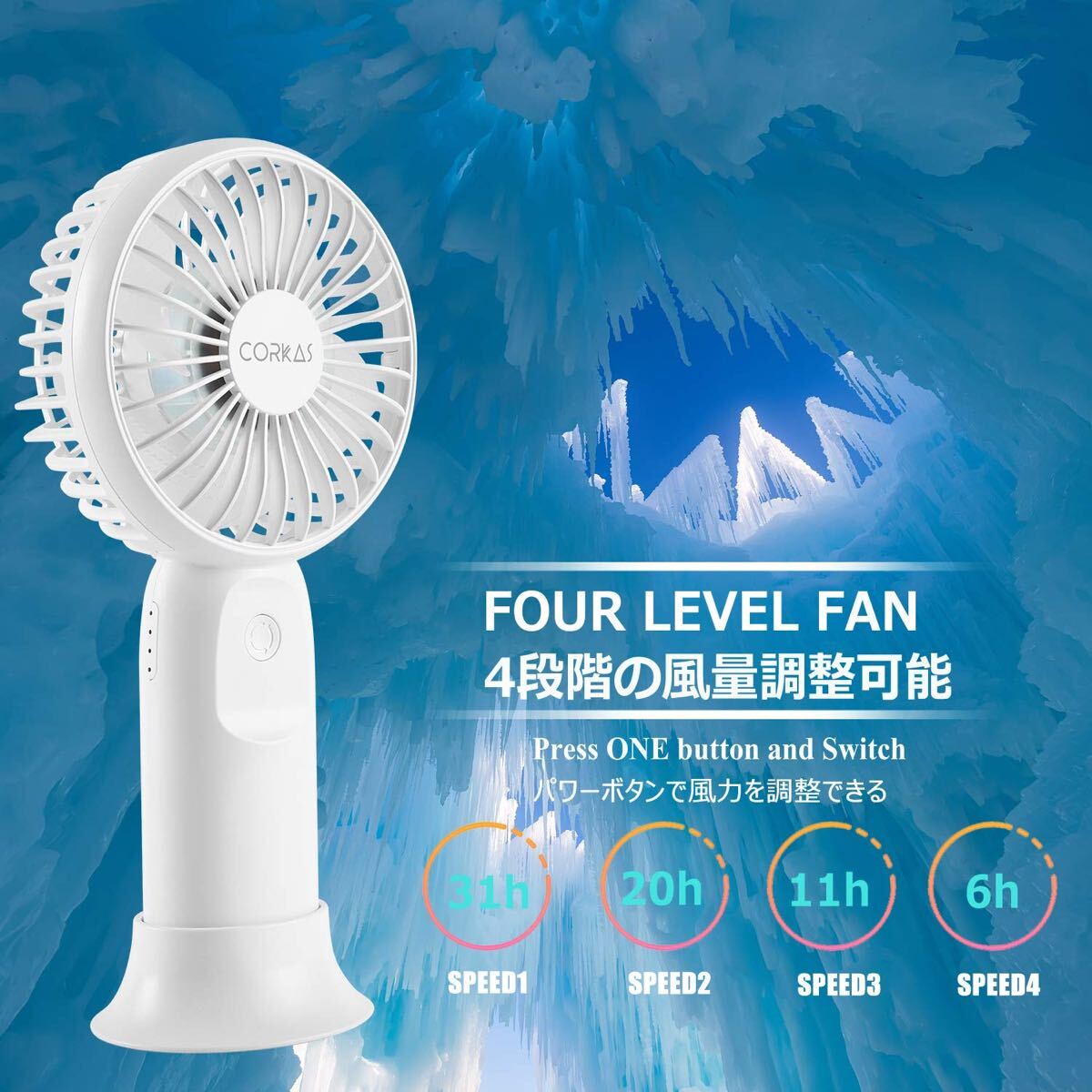 この携帯せんぷうきは、4段階の風量モードを搭載しており、4段階の強さも徐々に強くなります。お好みやニーズに合わせて自由に調節できます。1~2段階はリズム風と弱風モードで優しい自然風を再現し、超静音で職場や図書館でも気楽にご利用できます。3~4段階は中風や強風モードでパワフルに送風し、素早くムレ暑さを飛ばし、アウトドアやスポーツ観戦などに最適です。