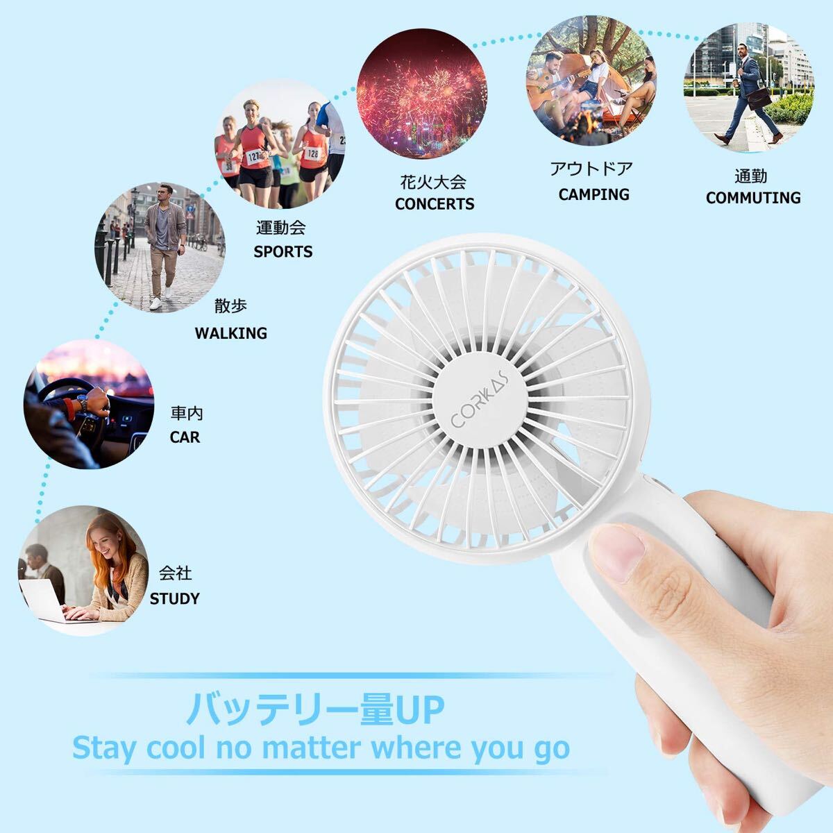 過充電・ 過放電・過電圧・過電流防止機能および短絡保護機能を備えた安全の回路設計で安心して使用ができます。特許取得済みのタービンファンブレード設計、静かで自然な風が感じられます。さらに、網目の細かい防止ネットによって、子供でも安心して使うことができます。