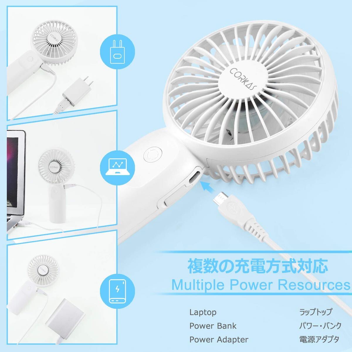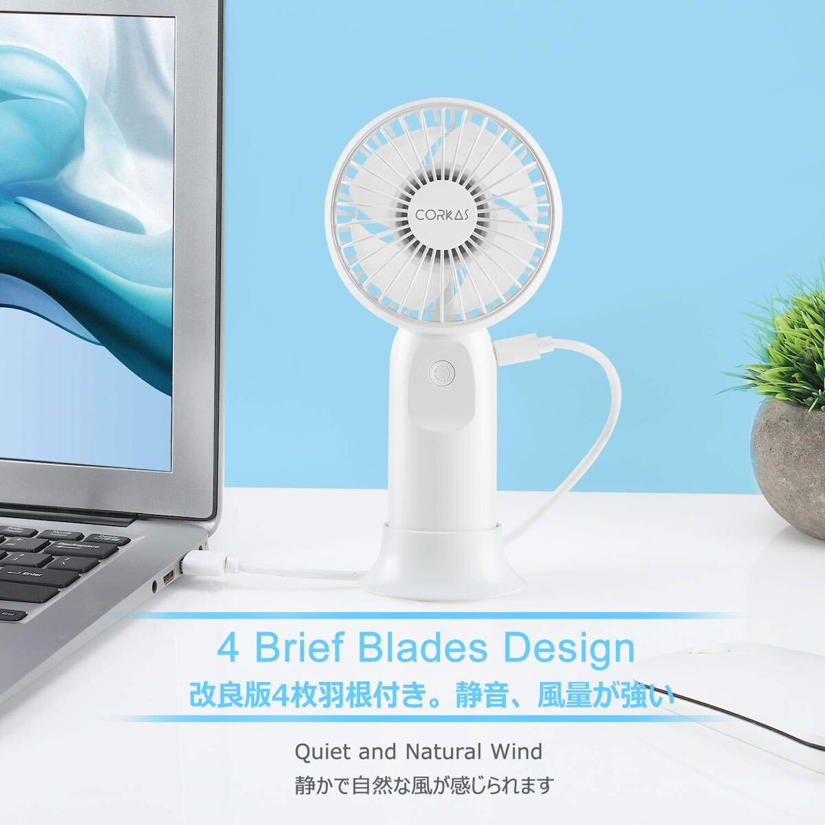 標準USBポート、複数の充電方式をサポートします。さらに4000mAhのバッテリー内蔵でスマートフォンなどのモバイルバッテリーとしても使えます。ハンディファンも、携帯充電器も持ち歩きたいけど、なるべく荷物を減らしたいという人にはおすすめのポータブル扇風機です。