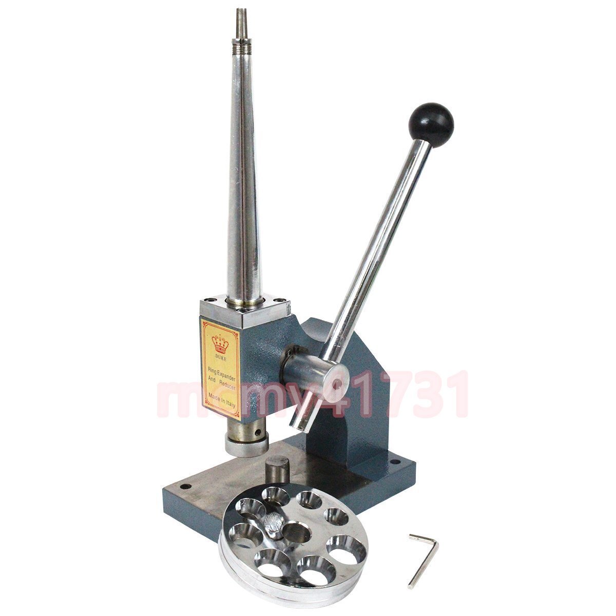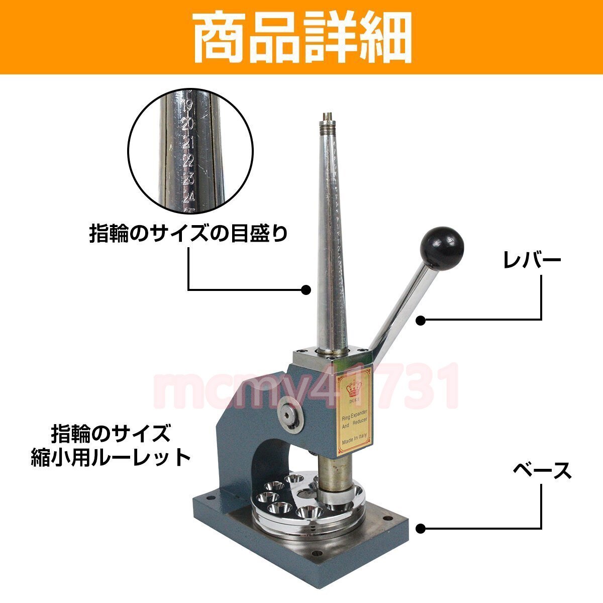 上部の棒に指輪をはめ、レバーを奥に倒すと棒が太くなって指輪のサイズをアップします。
