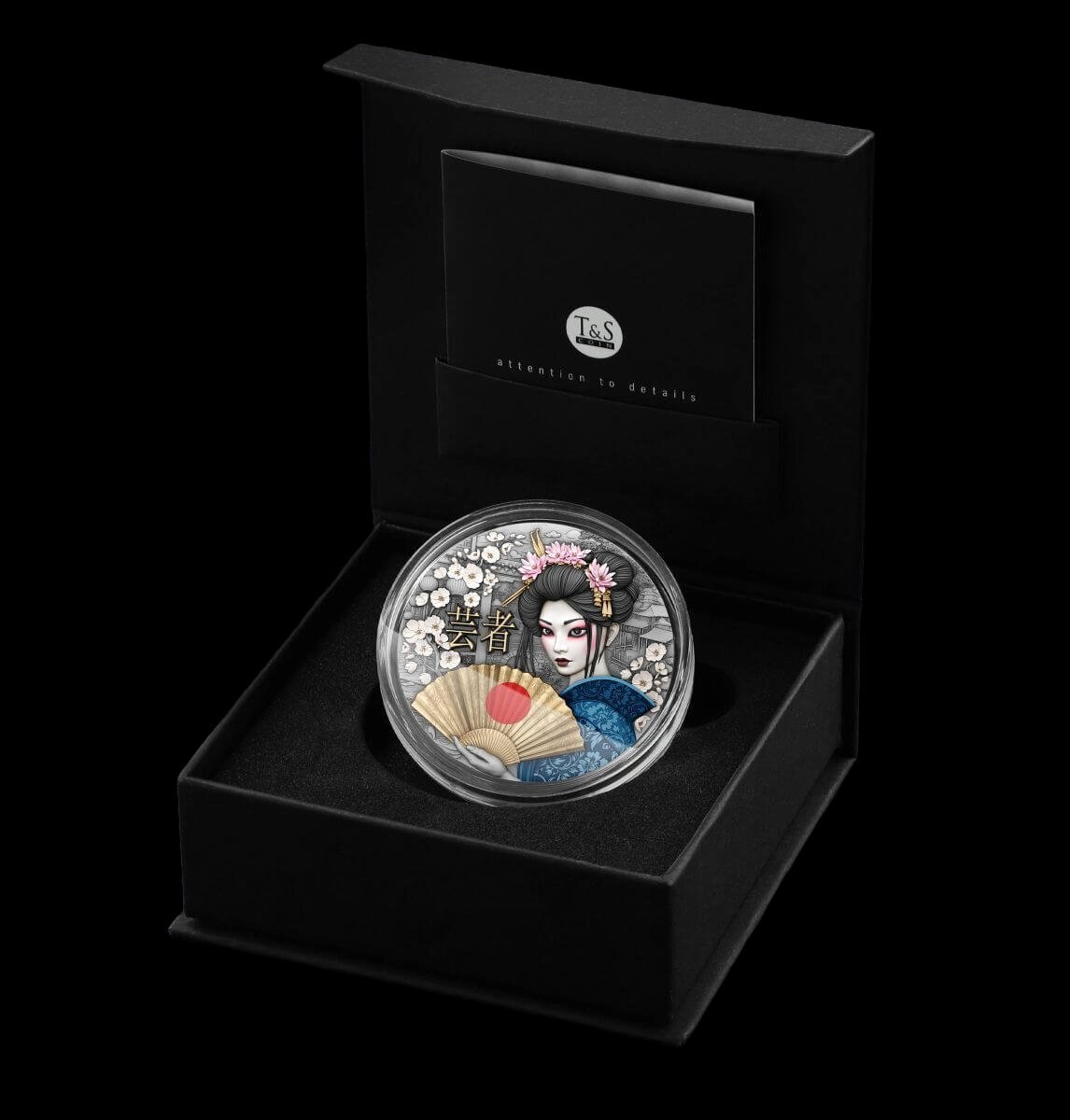 [保証書・カプセル付き] 2025年 (新品) ニウエ「芸者」純銀 2オンス ハイリリーフ アンティーク 金メッキ 銀貨