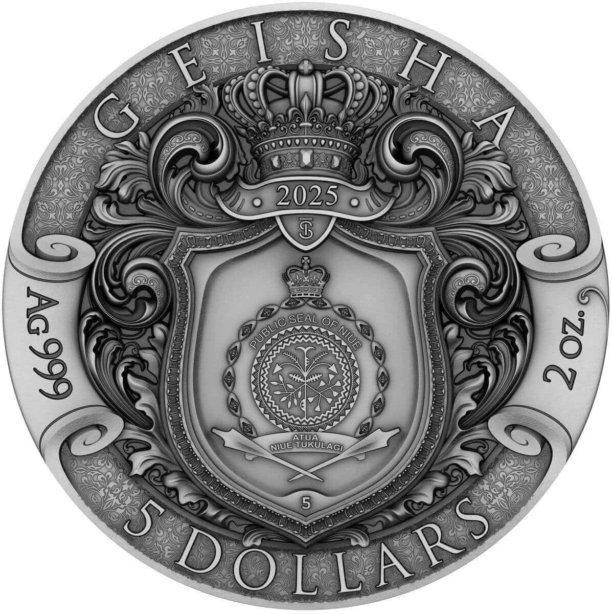 商品名  : 2025年 (新品) ニウエ「芸者」純銀 2オンス ハイリリーフ アンティーク 金メッキ 銀貨