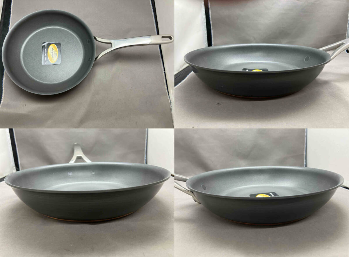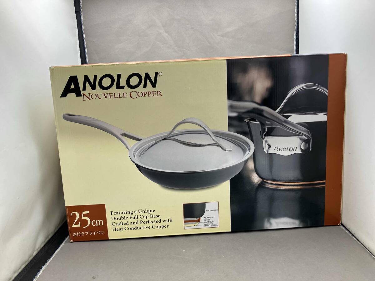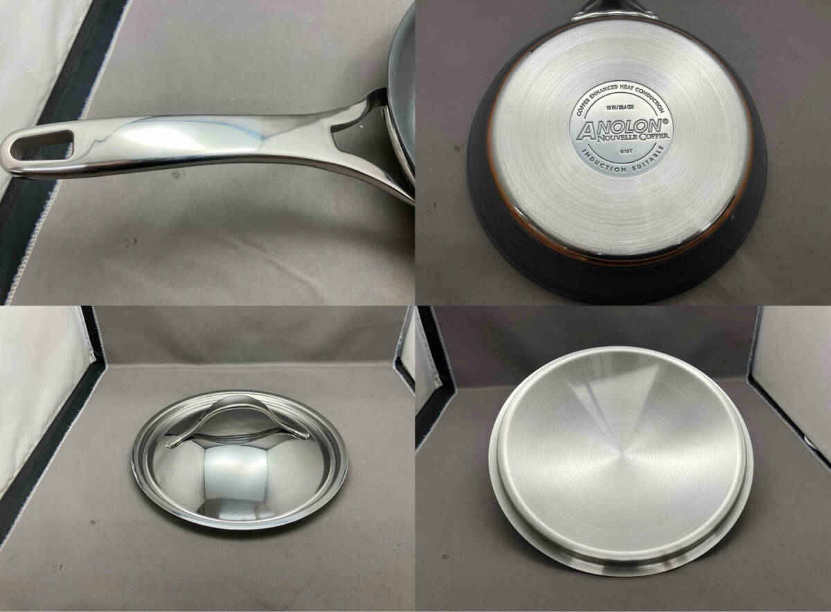 アナロンヌーヴェルカッパーの、25cm蓋付きフライパンになります。 ※キズ等の状態については写真のものをご参考ください。 ※付属品は写真のもので全てになります。 |