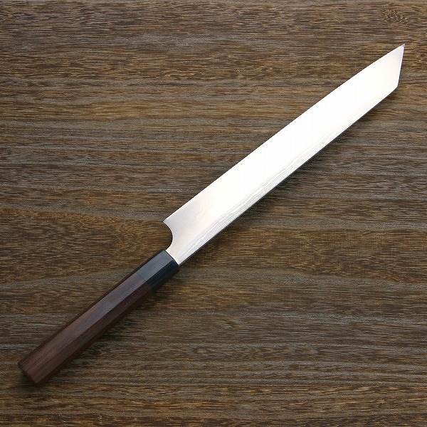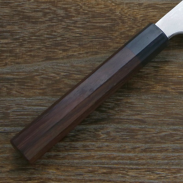 刃身の積層模様と紫檀柄が美しい本格和包丁です。