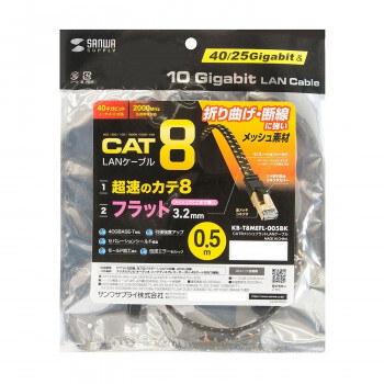 仕様 | カラー:ブラック コネクタ形状:RJ-45シールドコネクタ(スリムコネクタ、ツメ折れ防止カバー付き) ケーブル構造:STP(4対)、より線(30AWG)、ストレート結線 色配線:TIA/EIA-568B カテゴリ:CAT8 対応伝送帯域:カテゴリ8(40GBASE-T)、カテゴリ7A・カテゴリ7(10GBASE-T)、カテゴリ6A(10GBASE-T)、カテゴリ6(1000BASE-TX)、エンハンスドカテゴリ5(1000BASE-T)、カテゴリ5(100BASE-TX)、カテゴリ3(10BASE-T)適合 通信速度:40/25Gbps 周波数特性:2000MHz 検査:100%導通検査 |