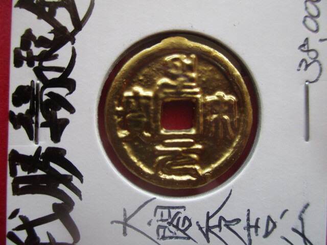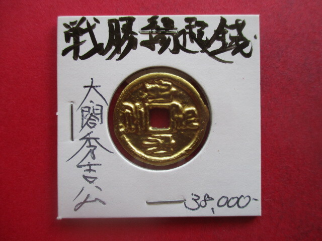 戦国時代、合戦に臨んだ武将が兜の奥に戦勝縁起銭を忍ばせていたことは広く知られていますが、こちらは太閤秀吉公が配下の武将に配ったものとのことです。他の多くの戦勝縁起銭と同様に金貨に漆を塗り、更に金塗装がほどこされています。一般に金泥(きんでい)と呼ばれる手法です。当時の流行であったのでしょう。古代中国の貨幣を模倣して作られたと伝え聞きますが、本物の渡来銭である可能性も排除できません。撮影の際の光の量によって実物と違った色に写ることがあります。汚れや細かい傷があります。タイトルに記載した量目は出張買取の際に先方(前所有者)宅の計量器で測定した値です。0.2g程度の誤差をお許しください。伝承に従ってタイトルに「金貨」「純金」と記載いたしましたが、金品位を記載した保証書が付属しておりませんのでトラブル防止のため「非金製品」として出品させていただきます。開始価格は買い値の10分の1以下とさせていただきますので、戦国武将に関心をお持ちの方のご入札をお待ちします。高騰防止のため即決価格を設定しました。自己紹介欄にオークション休業日を記載させていただいております。お手数とは存じますが、ご入札前にお読みいただければ幸いです。よろしくお願い申し上げます。