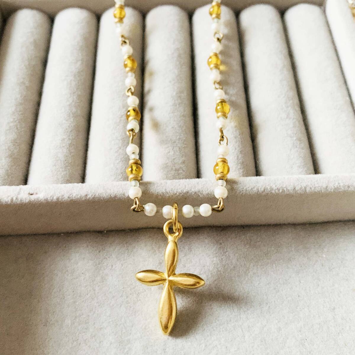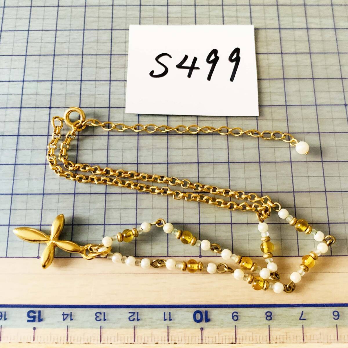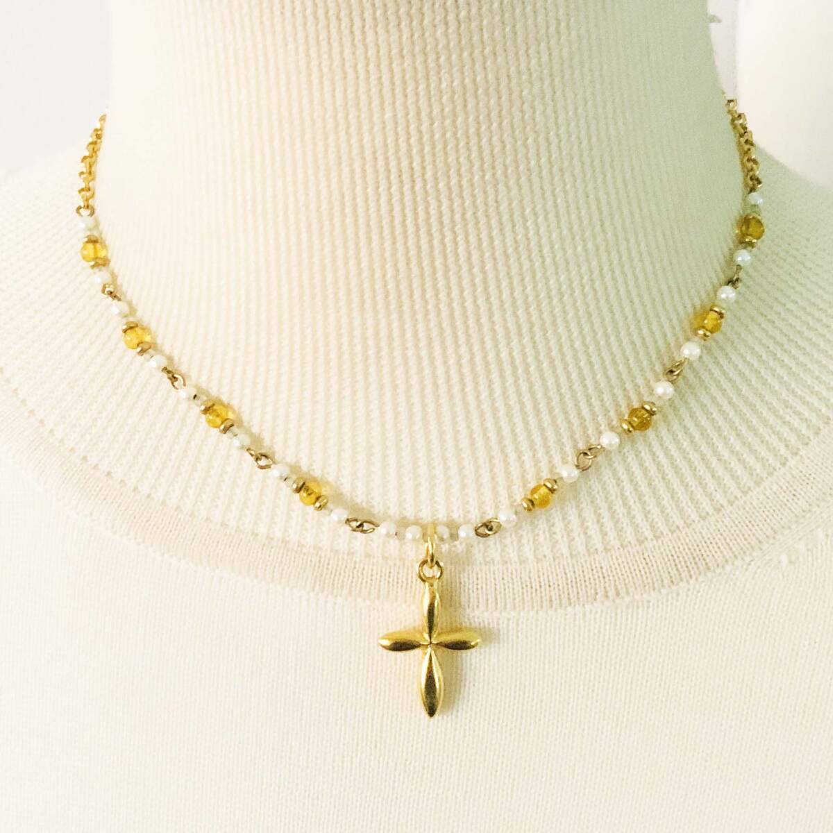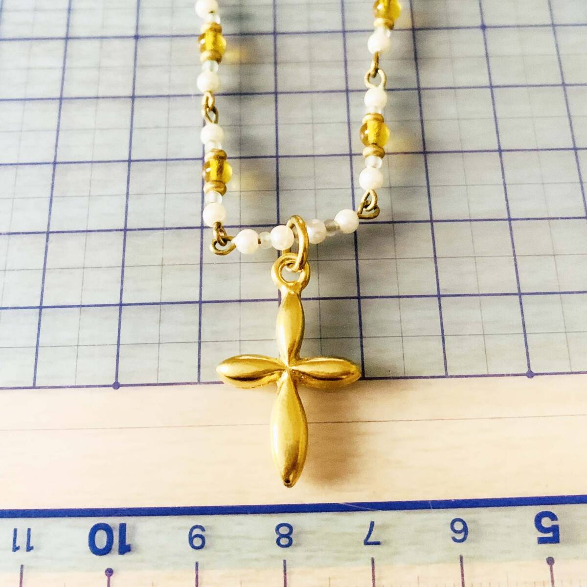 美品 瑠璃ガラスビーズ フェイクパール 十字クロスペンダントトップ ゴールド ネックレス No.S499