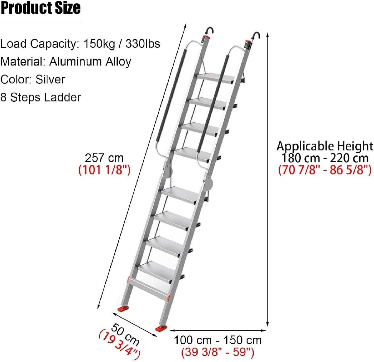 折りたたみ屋根裏はしご、180-220cmアルミニウム合金緊急はしごアームレスト&フック付き、幅18cmペダル、耐荷重330ポンド