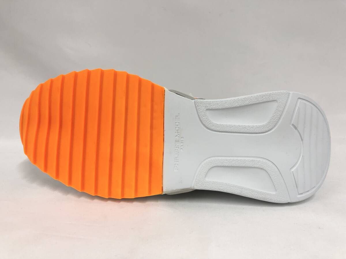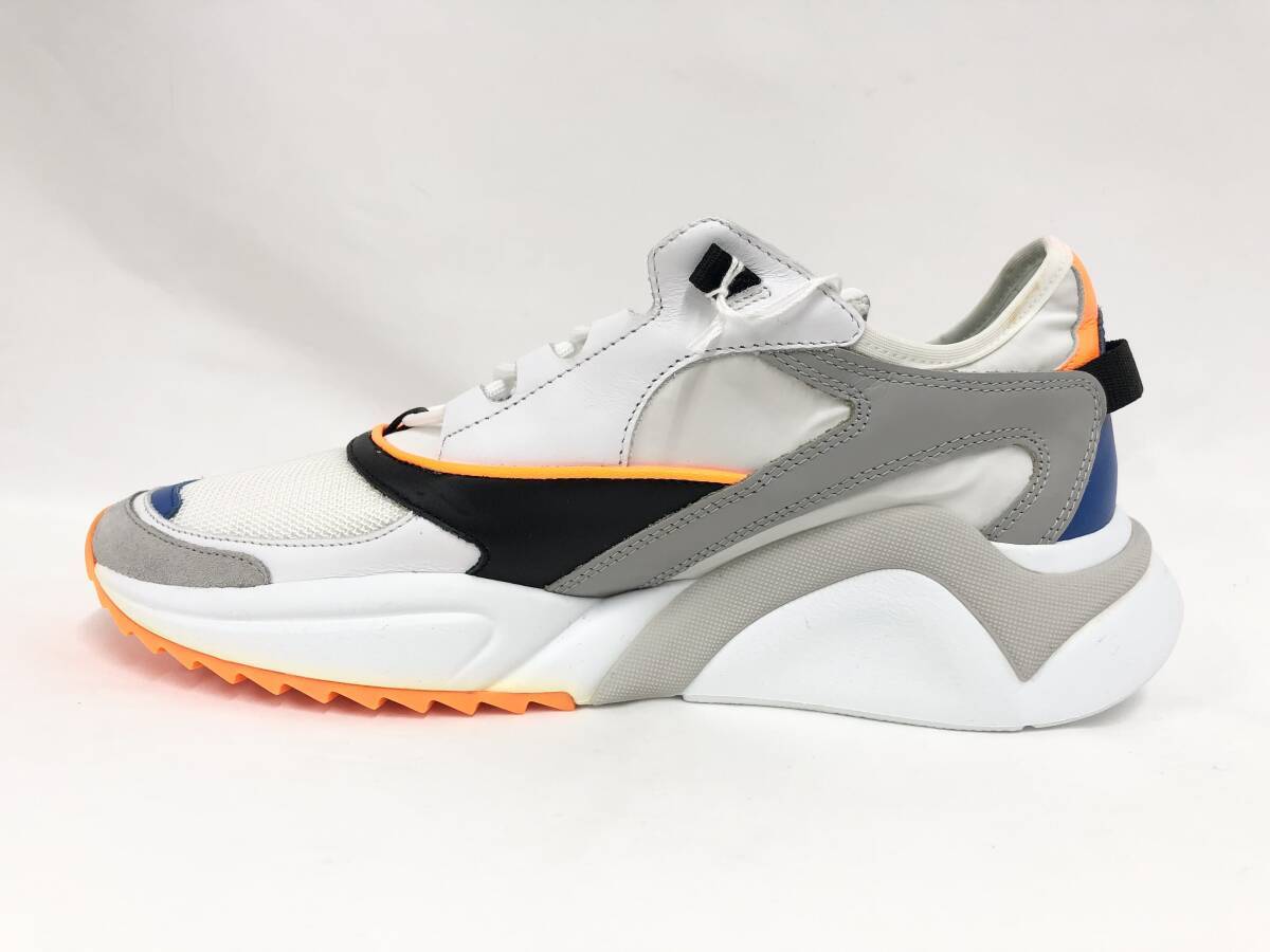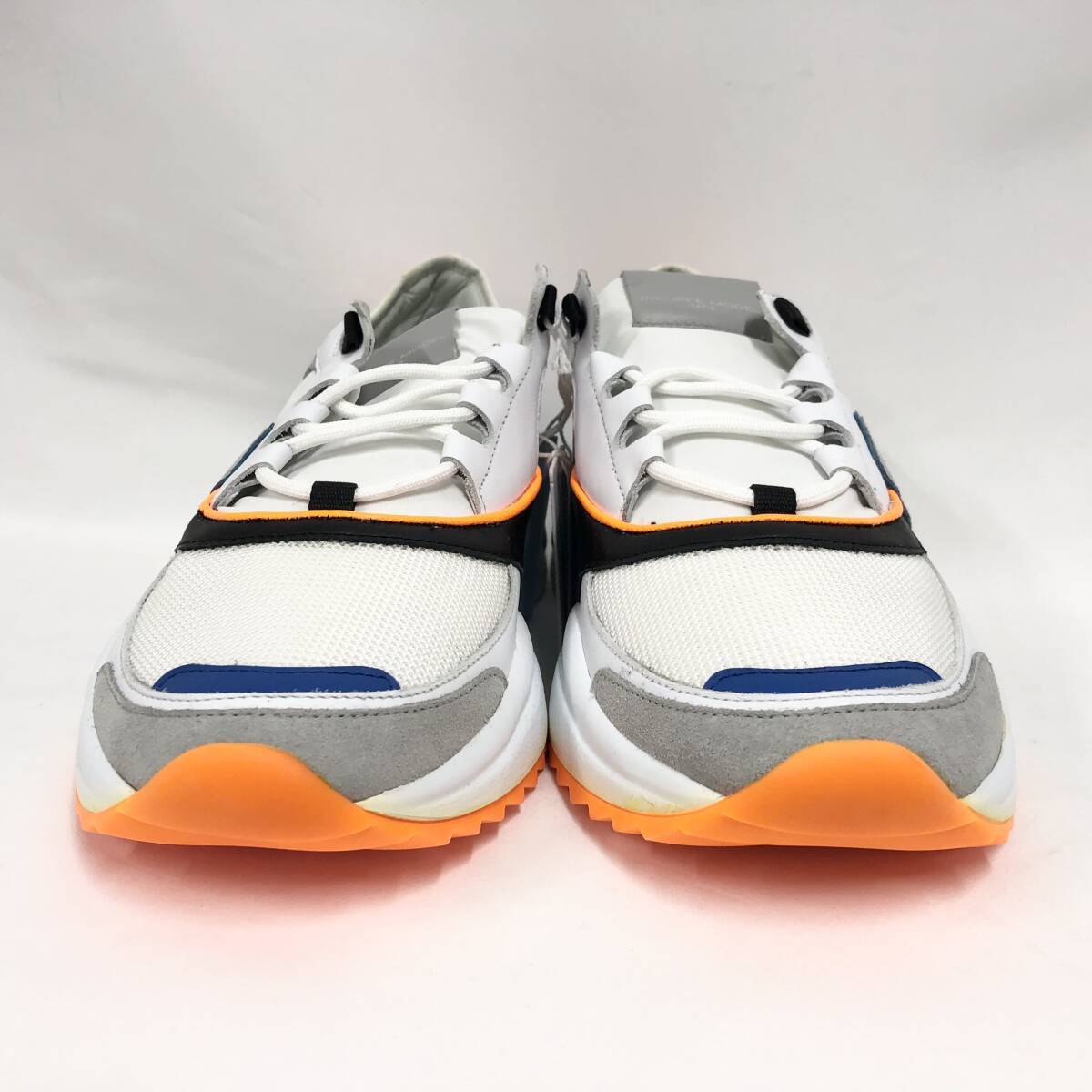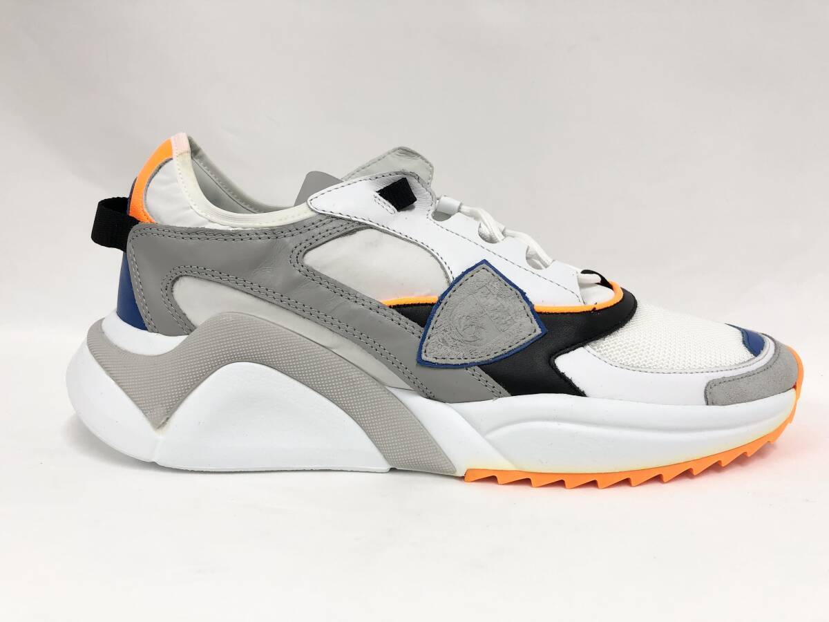 EZE Philippe Model のホワイトと蛍光オレンジのスニーカー、ワイドフィット。 2つの素材を使用したアッパーは、カーフスキン、スエード、ナイロンメッシュ生地で作られており、反射素材がインサートされています。ソールの高さ4.5cm。