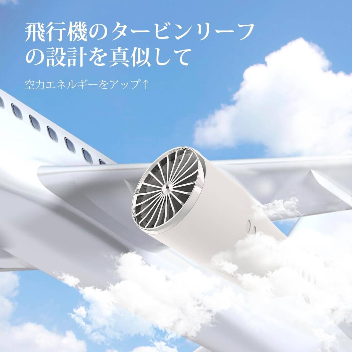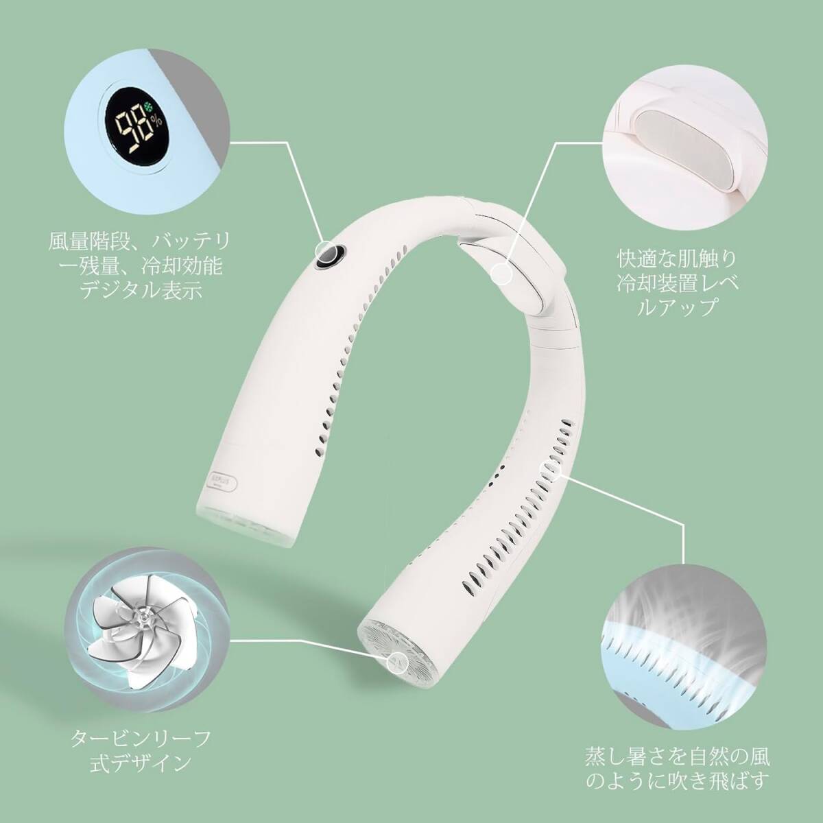 【特殊デザイン&持ち運び便利】ネッククーラーの 特殊デザインは飛行機のタービンリーフの設計を採用して、風量が従来より倍増! 首に掛けるだけで、両手を解放、暑い夏を乗り切ります。