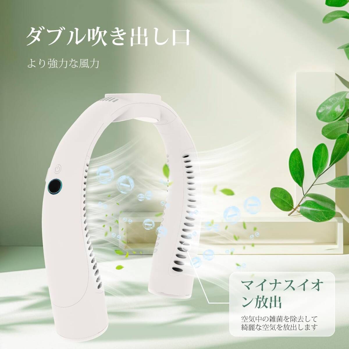 【ダブル送風口でマイナスイオン放出】ネックファンのダブル送風口設計のため、より多いマイナスイオンを取り込むマイナスイオン機能によって空気中の浮遊物質に帯電、反発作用により浮遊物質を除去し周りの空気を綺麗にする効果が期待できます。