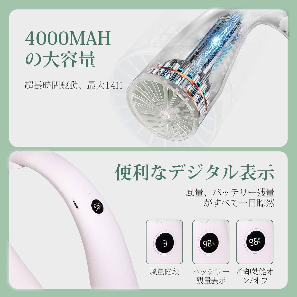【4000mAh大容量&LED画面表示】4000mAhの大容量バッテリーを搭載しているため長時間運転が可能で、風量も豊富です。TYPE-Cポートから充電することができます。風量階段、バッテリー残量、それと冷却効能は、本体に搭載されたディスプレイで確認することができます。