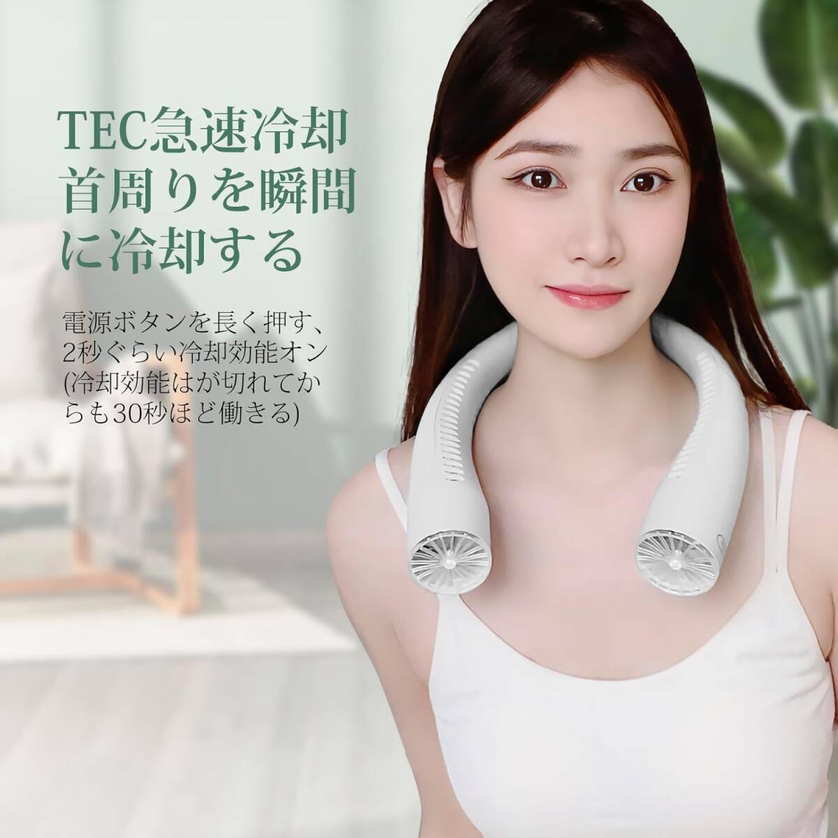 【3段階風量調節&TEC冷却】首掛け扇風機の風量は弱風・中風・強風の3段階から選択可能で、電源ボタンを繰り返し押すだけで、適切な風量に切り替わります。電源ボタンを長押しで冷却効能オン。冷却効能はオフにしても30秒ほど働きます。