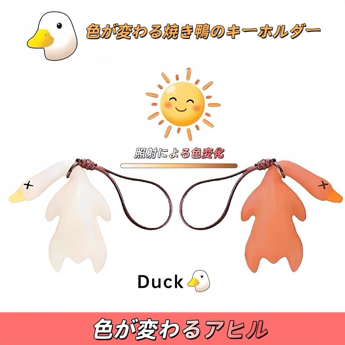 色が変わる不思議な焼き鴨チャーム:日光に当たると色が変わる不思議な焼き鴨のデザイン。車内やバックに掛けるだけで、視覚的に楽しめるアイテムです。