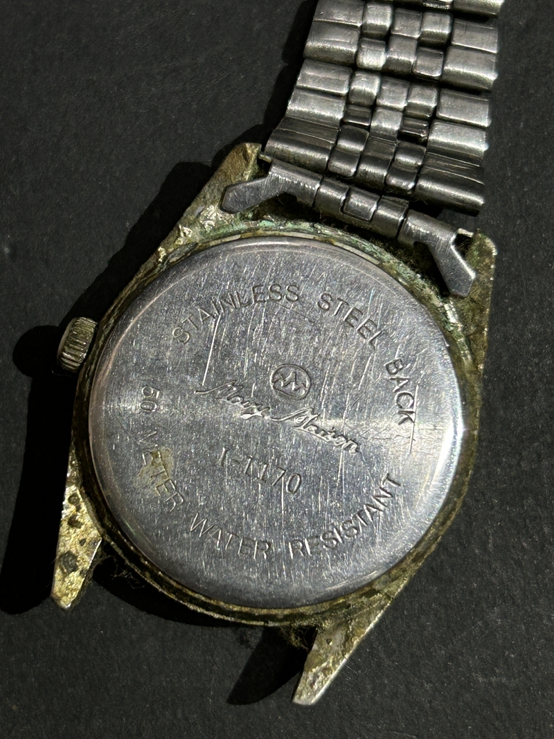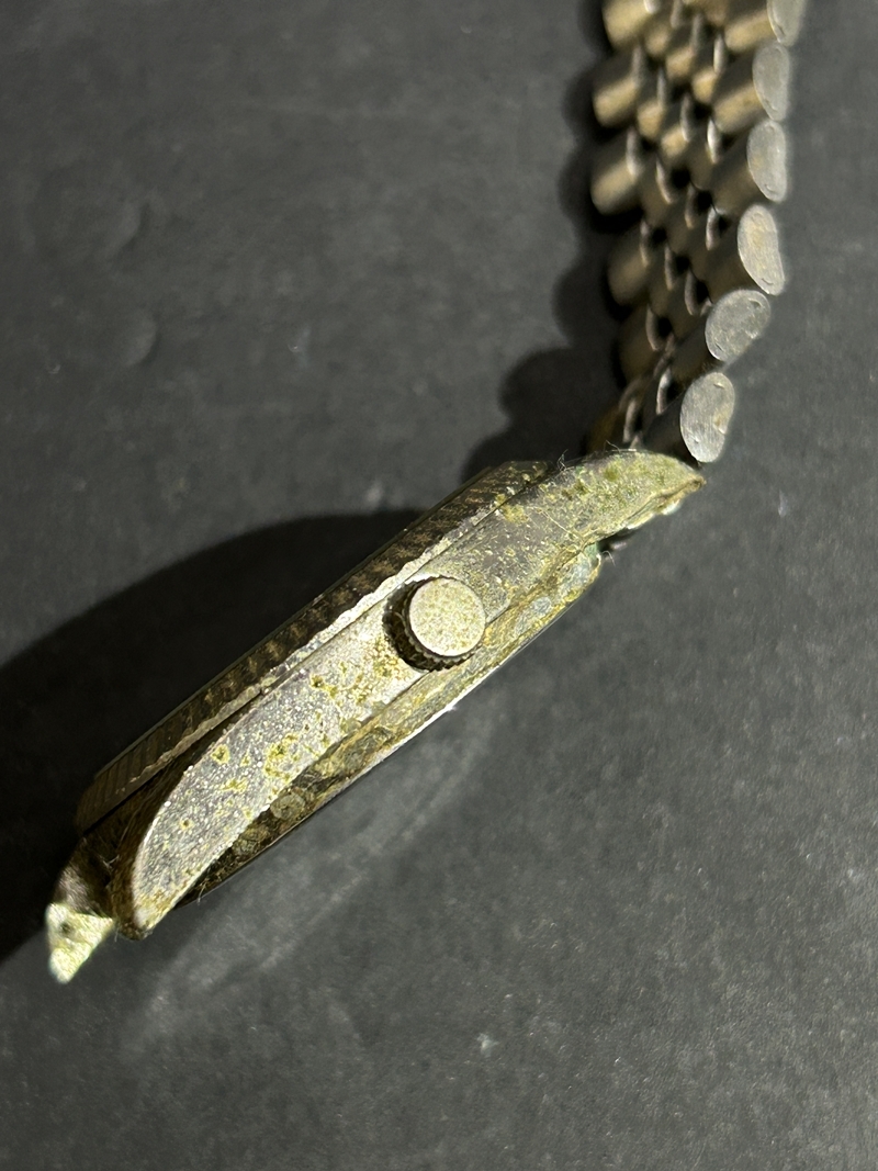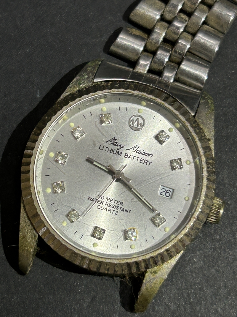 | mavy maison 腕時計 の出品です。 動作はしませんのでジャンク品としての出品です。 ベルトは破損しています。 経年による傷や汚れ、錆、風防の傷などがあります。 リューズは固くて回せませんでした。 状態など写真でご確認の上、ご検討ください。 写真にある物で全てです。 基本的には used品の出品になります。 本文の記載事項があっても 現物優先とさせていただきます。 予めご了承下さいませ。 動作確認済みの物でも、時間の経過後の動作の保証はできません。 その他不明な点がございましたら、当方がわかる範囲にてお答えします。 | |||