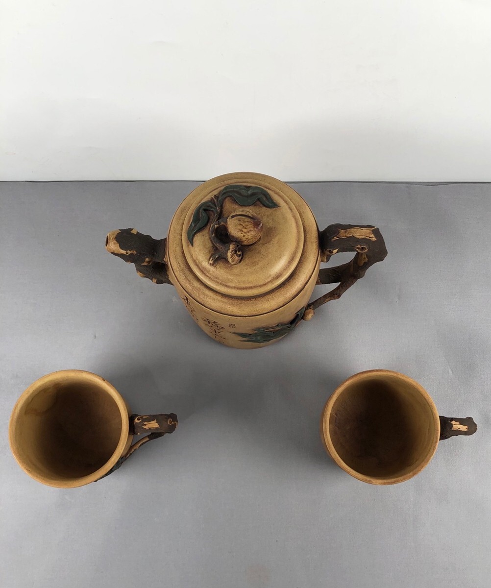 近時代 紫砂彫 福禄寿老紫砂茶壺 茶杯1セット 汪寅仙【仁】中国陶磁器 急須 茶壷 茶道具 置物 蔵出