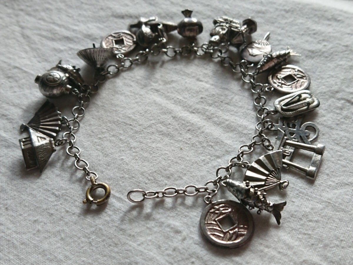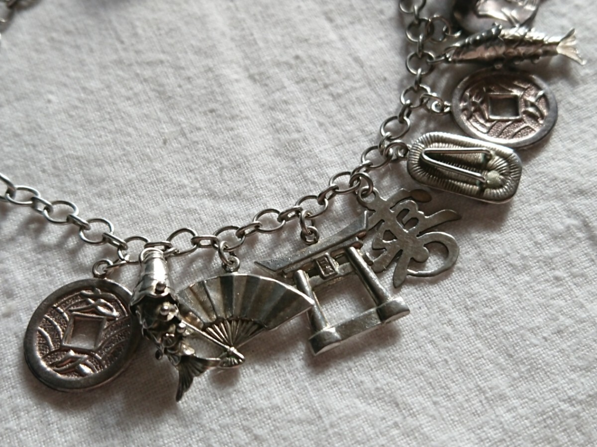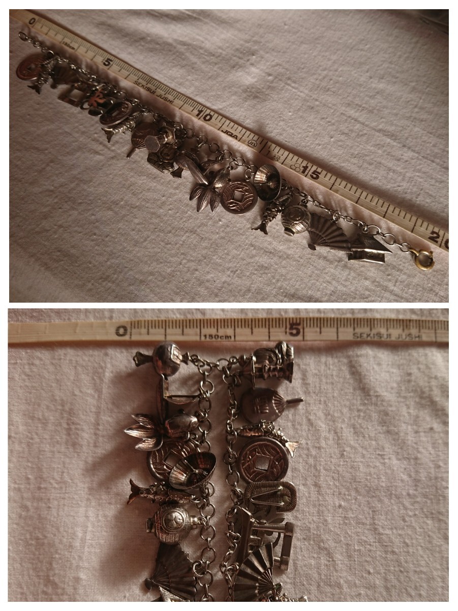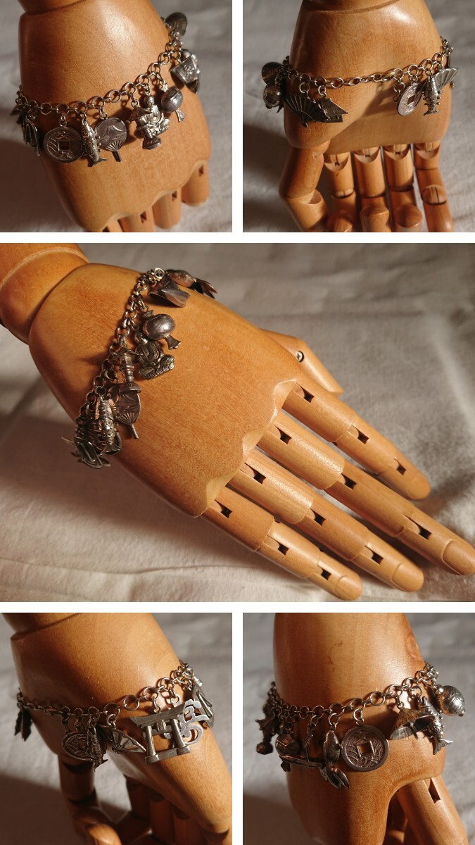 古い昭和期物の和モチーフチャームブレスレットです。時代物になりますので少々の小傷や金属汚れございます。ブレスレットの留め具部分のみ磁石反応がございましたがチェーンとチャームには磁石反応はございません(金属が何かまではわかりません)。なかなかこのてのチャームブレスもでてきませんのでおすすめです。