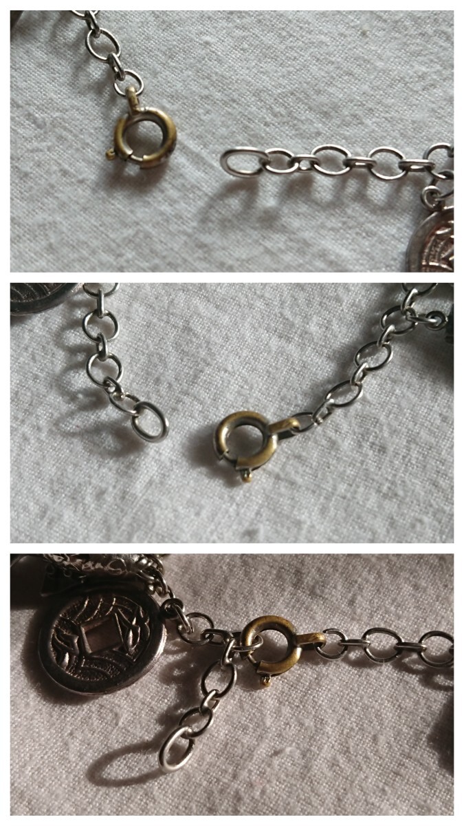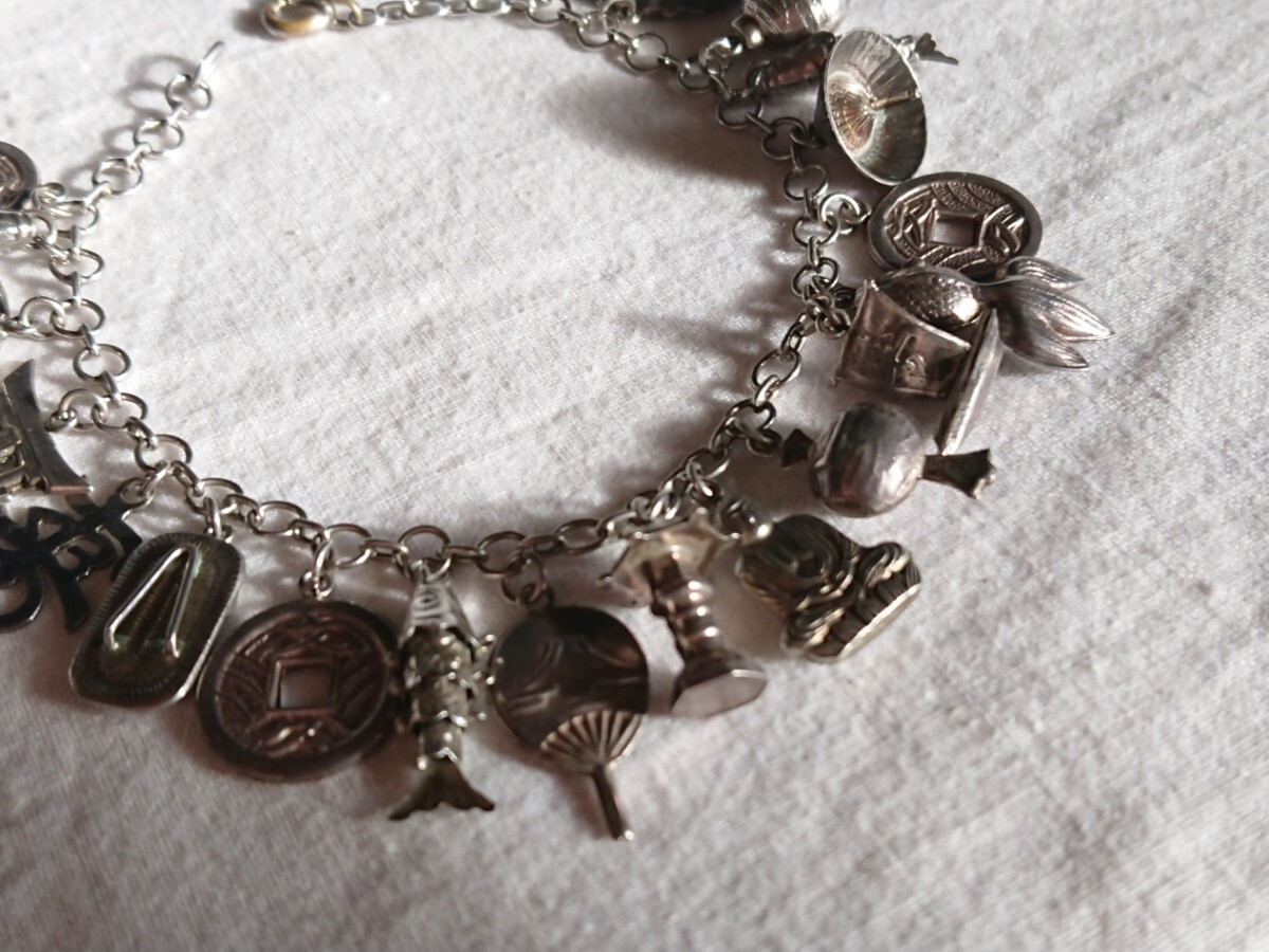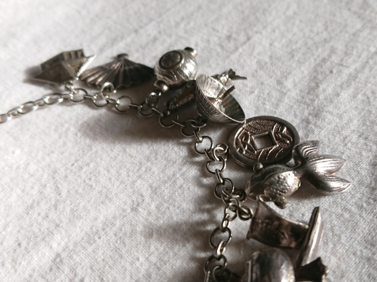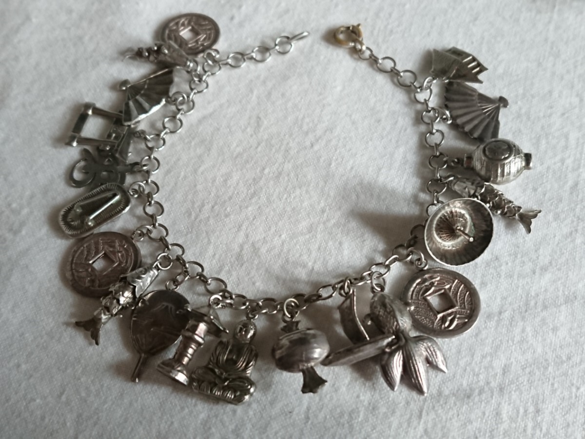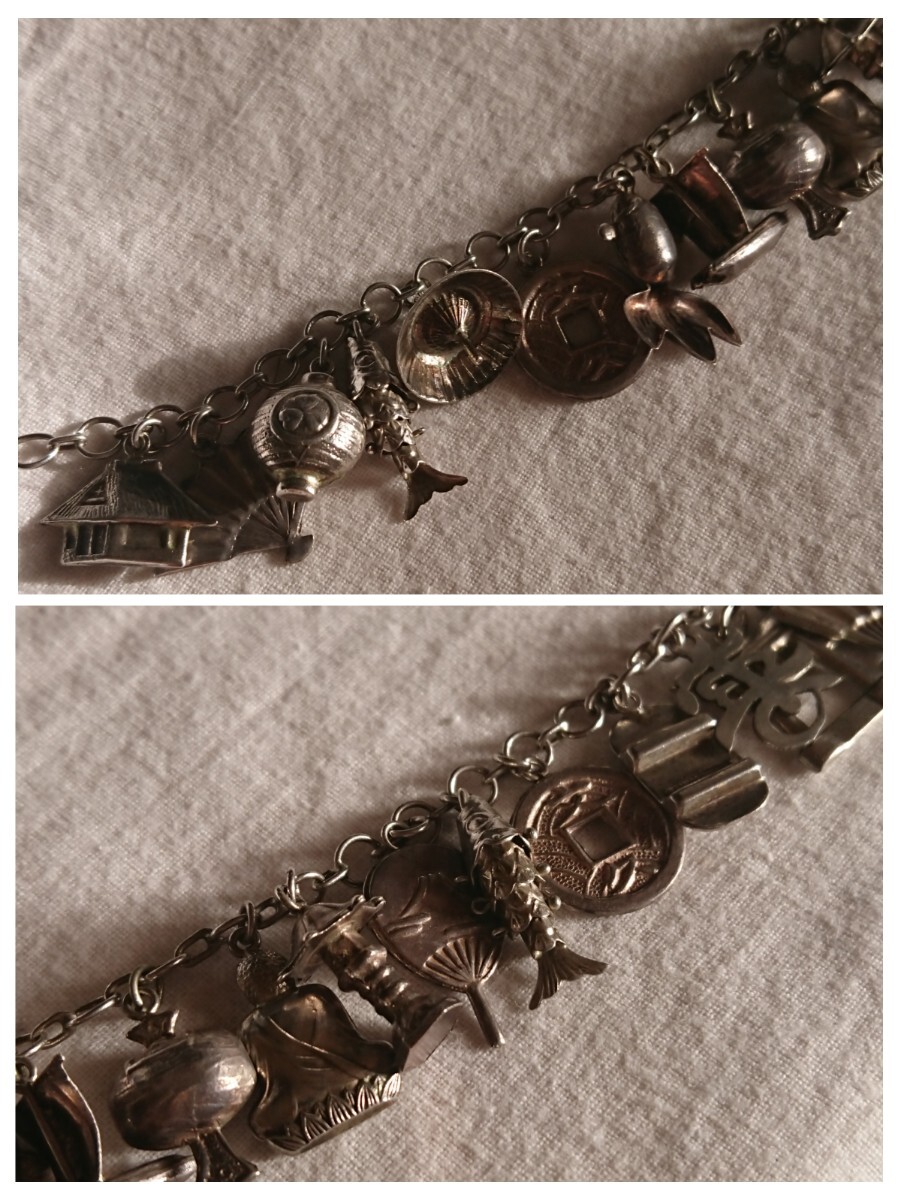 古い昭和期物の和モチーフチャームブレスレットです。時代物になりますので少々の小傷や金属汚れございます。ブレスレットの留め具部分のみ磁石反応がございましたがチェーンとチャームには磁石反応はございません(金属が何かまではわかりません)。なかなかこのてのチャームブレスもでてきませんのでおすすめです。