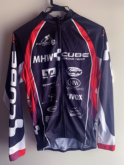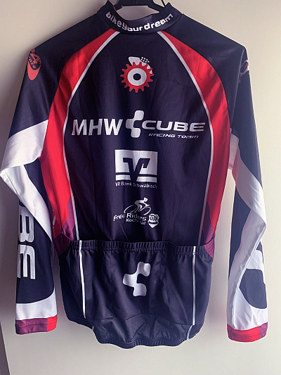 MHW CUBE RACING TEAMのネイビー/レッド/ホワイトの長袖サイクルジャケット、サイズS、バックポケット付き。