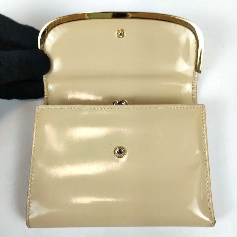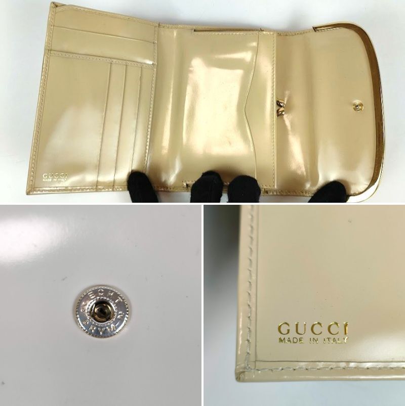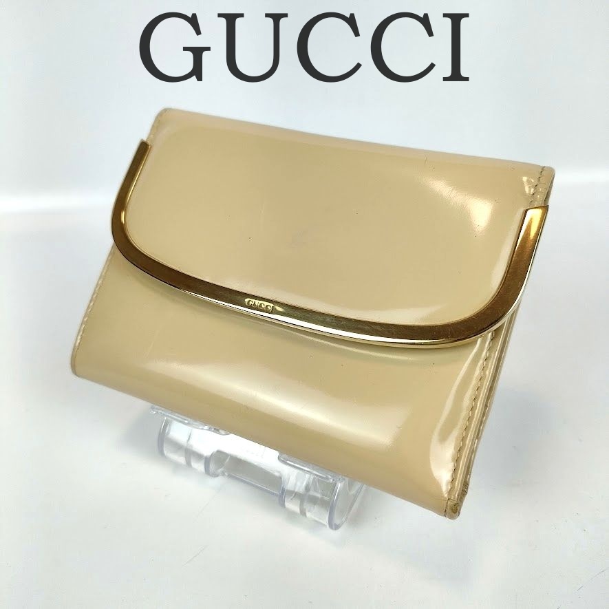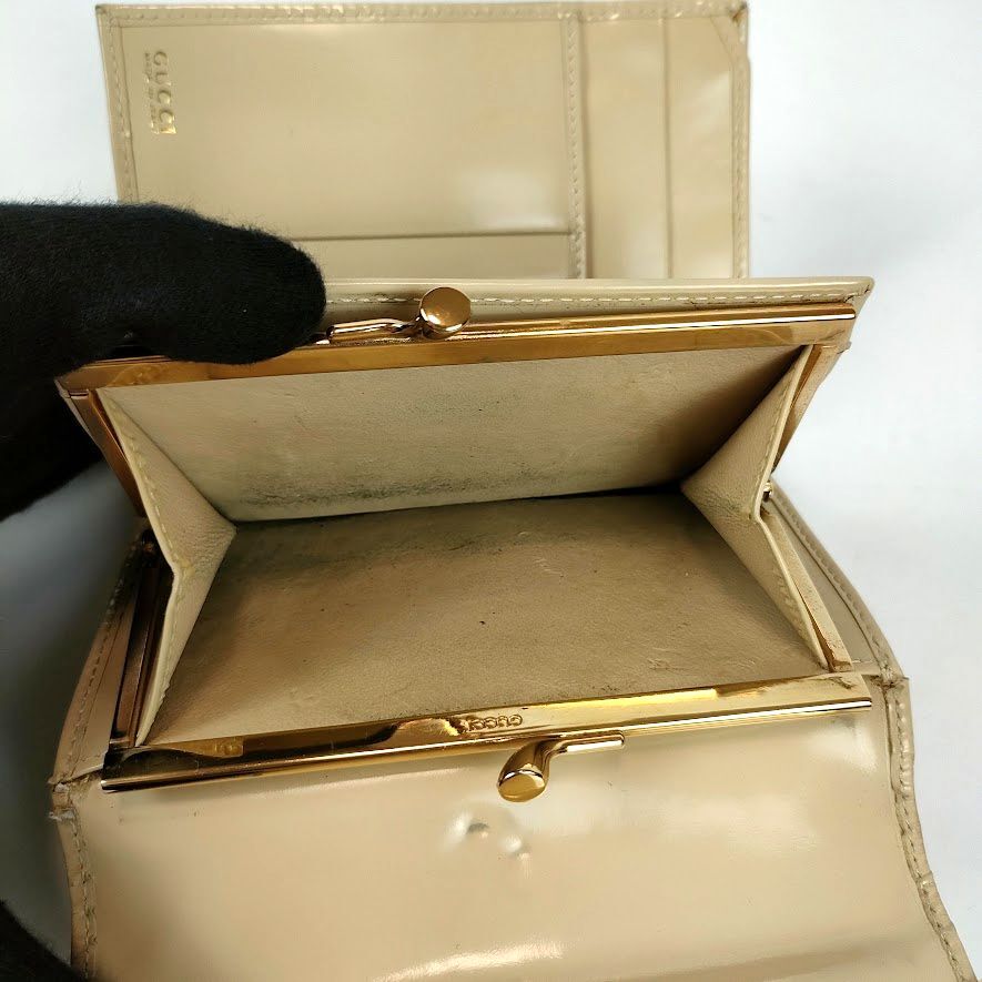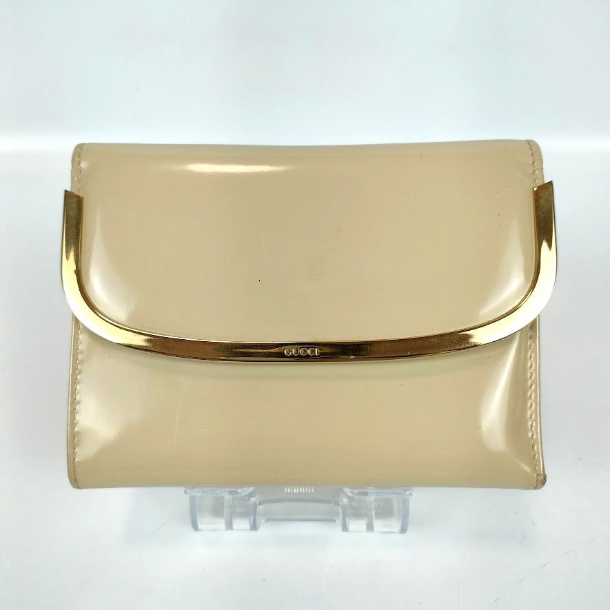 GUCCI グッチ 三つ折り 財布 がま口 ホック ベージュ エナメル パテント レザー ヴィンテージ 金具ゴールド オールドグッチ レア 希少 ロゴ