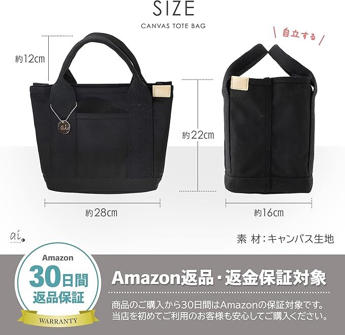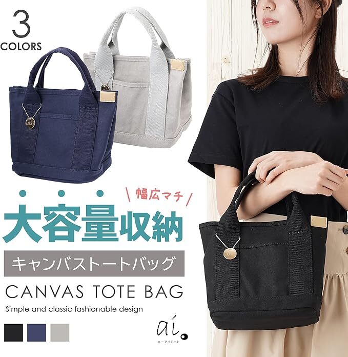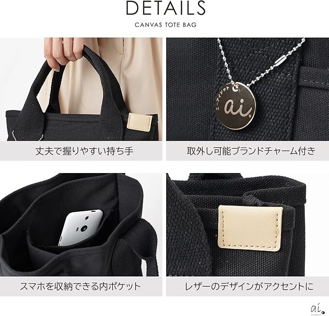 • 【商品詳細】 〇サイズ:(縦)約22cm×(横)約23cm×(マチ)約16cm(持ち手)約12cm 〇カラー:ブラック、ブルー、グレー 〇素材:キャンバス生地 ○重量:350g 〇セット内容:バッグ、ブランドロゴチャーム 〇ポケット数:内2つ、外1つ 〇ブランド:エーアイドット ai.